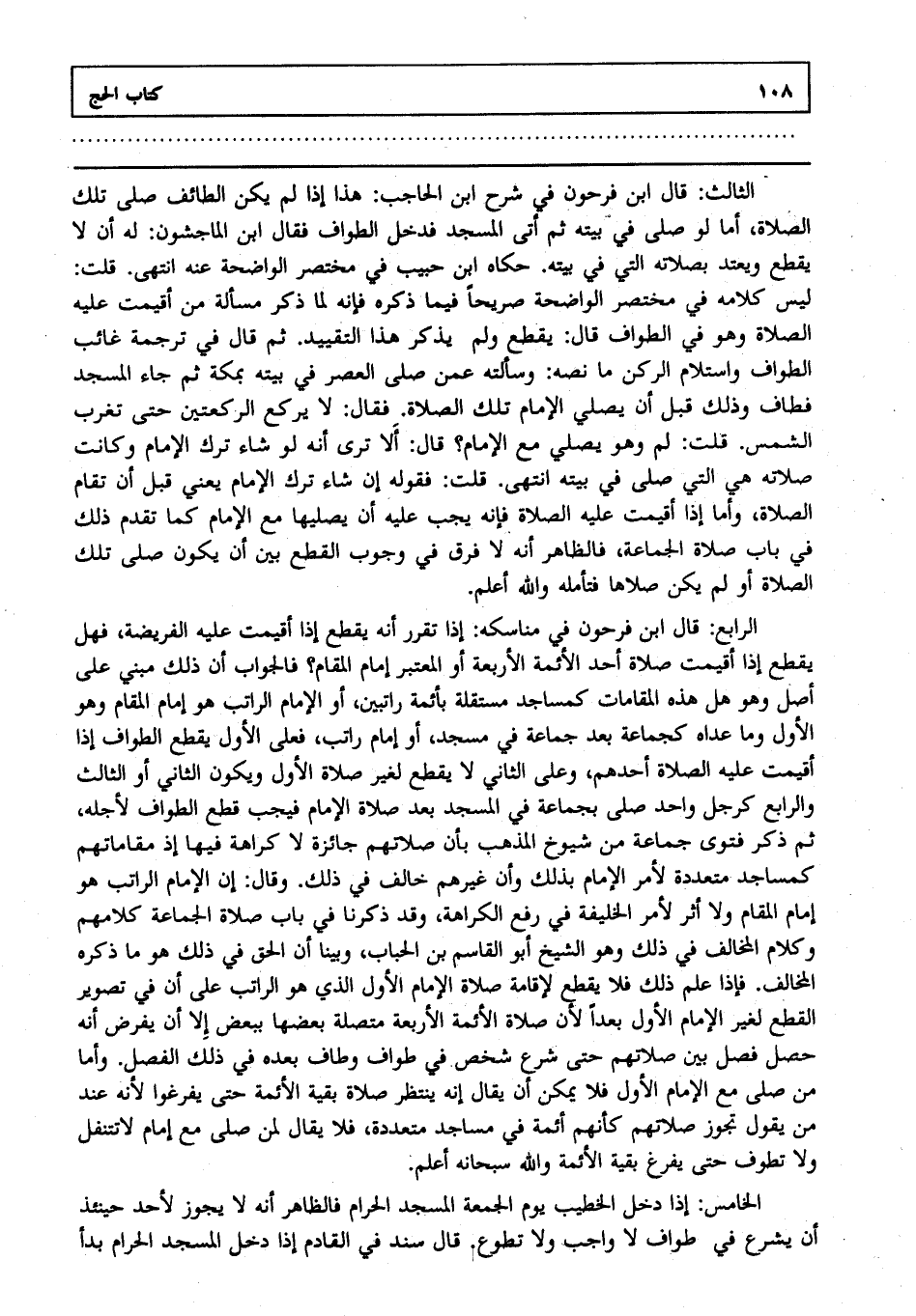 الرابع: قال ابن فرحون في مناسكه إذا تقرر أنه يقطع إذا أقيمت عليه الفريضة فهل يقطع إذا أقيمت صلاة أحد الأئمة الأربعة أو المعتبر إمام المقام فالجواب أن ذلك مبني على أصل وهو هل هذه المقامات كمساجد مستقلة بأئمة راتبين أو الإمام الراتب هو إمام المقام وهو الأول وما عداه كجماعة بعد جماعة في مسجد أو إمام راتب فعلى الأول يقطع الطواف إذا أقيمت عليه الصلاة أحدهم وعلى الثاني لا يقطع لغير صلاة الأول ويكون الثاني أو الثالث والرابع كرجل واحد صلى بجماعة في المسجد بعد صلاة الإمام فيجب قطع الطواف لأجله ثم ذكر فتوى جماعة من شيوخ المذهب بأن صلاتهم جائزة لا كراهة فيها إذ مقاماتهم كمساجد متعددة لأمر الإمام بذلك وأن غيرهم خالف في ذلك. وقال إن الإمام الراتب هو إمام المقام ولا أثر لأمر الخليفة في رفع الكراهة وقد ذكرنا في باب صلاة الجماعة كلامهم وكلام المخالف في ذلك وهو الشيخ أبو القاسم بن الحباب وبينا أن الحق في ذلك هو ما ذكره المخالف. فإذا علم ذلك فلا يقطع لإقامة صلاة الإمام الأول الذي هو الراتب على أن في تصوير القطع لغير الإمام الأول بعدا لأن صلاة الأئمة الأربعة متصلة بعضها ببعض إلا أن يفرض أنه حصل فصل بين صلاتهم حتى شرع شخص في طواف وطاف بعده في ذلك الفصل. وأما من صلى مع الإمام الأول فلا يمكن أن يقال إنه ينتظر صلاة بقية الأئمة حتى يفرغوا لأنه عند من يقول تجوز صلاتهم كأنهم أئمة في مساجد متعددة فلا يقال لمن صلى مع إمام لا تتنفل ولا تطوف حتى يخلو بقية الأئمة والله سبحانه أعلم.