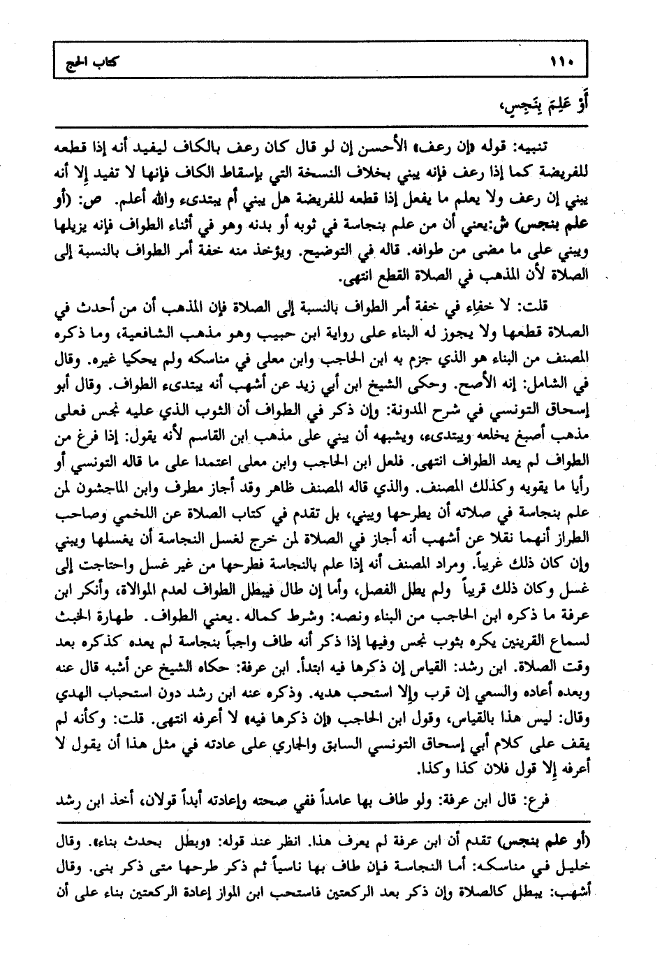 تنبيه: قوله إن رعف الأحسن إن لو قال كان رعف بالكاف ليفيد أنه إذا قطعه للفريضة كما إذا رعف فإنه يبني بخلاف النسخة التي بإسقاط الكاف فإنها لا تفيد إلا أنه يبني إن رعف ولا يعلم ما يفعل إذا قطعه للفريضة هل يبني أم يبتدئ والله أعلم. ص: "أو علم بنجس" ش: يعني أن من علم بنجاسة في ثوبه أو بدنه وهو في أثناء الطواف فإنه يزيلها ويبني على ما مضى من طوافه. قاله في التوضيح. ويؤخذ منه خفة أمر الطواف بالنسبة إلى الصلاة لأن المذهب في الصلاة القطع انتهى.
