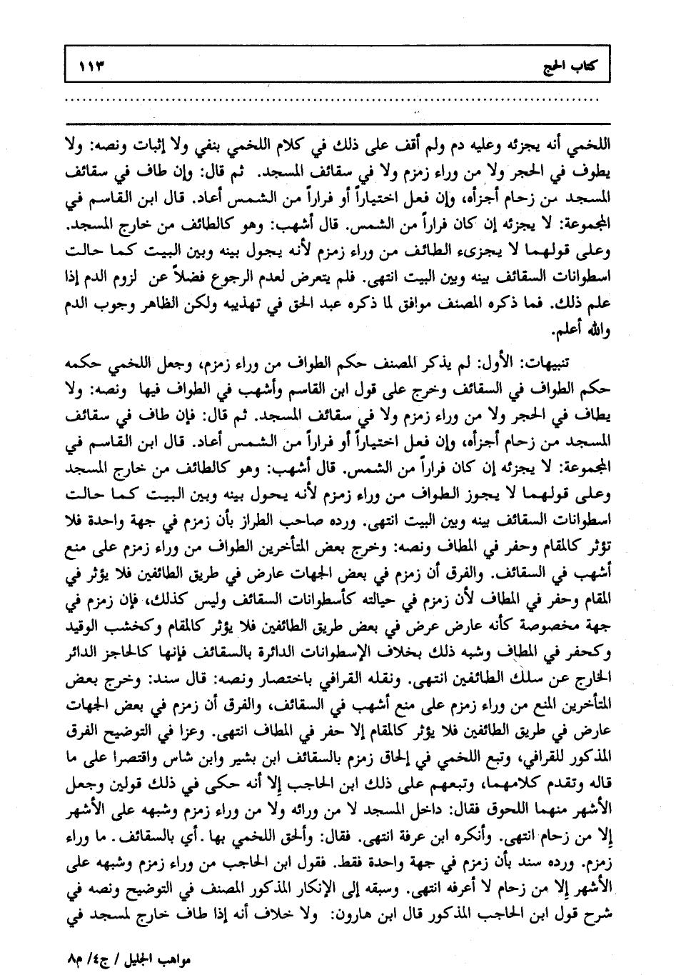 تنبيهات: الأول: لم يذكر المصنف حكم الطواف من وراء زمزم وجعل اللخمي حكمه حكم الطواف في السقائف وخرج على قول ابن القاسم وأشهب في الطواف فيها ونصه ولا يطاف في الحجر ولا من وراء زمزم ولا في سقائف المسجد. ثم قال فإن طاف في سقائف المسجد من زحام أجزأه وإن فعل اختيارا أو فرارا من الشمس أعاد. قال ابن القاسم في المجموعة لا يجزئه إن كان فرارا من الشمس. قال أشهب وهو كالطائف من خارج المسجد وعلى قولهما لا يجوز الطواف من وراء زمزم لأنه يحول بينه وبين البيت كما حالت إسطوانات السقائف بينه وبين البيت انتهى. ورده صاحب الطراز بأن زمزم في جهة واحدة فلا تؤثر كالمقام وحفر في المطاف ونصه وخرج بعض المتأخرين الطواف من وراء زمزم على منع أشهب في السقائف. والفرق أن زمزم في بعض الجهات عارض في طريق الطائفين فلا يؤثر في المقام وحفر في المطاف لأن زمزم في حيالته كأسطوانات السقائف وليس كذلك فإن زمزم في جهة مخصوصة كأنه عارض عرض في بعض طريق الطائفين فلا يؤثر كالمقام وكخشب الوقيد وكحفر في المطاف وشبه ذلك بخلاف الإسطوانات الدائرة بالسقائف فإنها كالحاجز الدائر الخارج عن سلك الطائفين انتهى. ونقله القرافي باختصار ونصه قال سند وخرج بعض المتأخرين المنع من وراء زمزم على منع أشهب في السقائف والفرق أن زمزم في بعض الجهات عارض في طريق الطائفين فلا يؤثر كالمقام إلا حفر في المطاف انتهى. وعزا في التوضيح الفرق المذكور للقرافي وتبع اللخمي في إلحاق زمزم بالسقائف ابن بشير وابن شاس واقتصرا على ما قاله وتقدم كلامهما وتبعهم على ذلك ابن الحاجب إلا أنه حكى في ذلك قولين وجعل الأشهر منهما اللحوق فقال داخل المسجد لا من ورائه ولا من وراء زمزم وشبهه على الأشهر إلا من زحام انتهى. وأنكره ابن عرفة انتهى. فقال وألحق اللخمي بها أي بالسقائف ما وراء زمزم. ورده سند بأن زمزم في جهة واحدة فقط. فقول ابن الحاجب من وراء زمزم وشبهه على الأشهر إلا من زحام لا أعرفه انتهى. وسبقه إلى الإنكار المذكور المصنف في التوضيح ونصه في شرح قول ابن الحاجب المذكور قال ابن هارون ولا خلاف أنه إذا طاف خارج لمسجد في