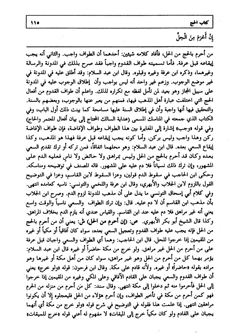 من أحرم بالحج من الحل فأفاد كلامه شيئين أحدهما أن الطواف واجب. والثاني أنه يجب إيقاعه قبل عرفة. فأما تسميته طواف القدوم واجبا فقد صرح بذلك في المدونة والرسالة وغيرهما وذكره ابن عرفة وغيره وقبلوه. وقال ابن عبد السلام وقد أطلق عليه في المدونة في غير موضع الوجوب. وزعم غير واحد أنه ليس بواجب وأن إطلاق الوجوب عليه في المدونة على سبيل المجاز وهو بعيد لمن تأمل لفظه مع تكراره لذلك. واعلم أن طواف القدوم من أفعال الحج التي اختلفت عبارة أهل المذهب فيها فمنهم من يعبر عنها بالوجوب وبعضهم بالسنة. والتحقيق فيها أنها واجبة وأن في إطلاق السنة عليها مسامحة كما بينت ذلك أول الباب وفي الكتاب الذي جمعته في المناسك المسمى "هداية السالك المحتاج إلى بيان أفعال المعتمر والحاج" وفي قوله "وجب" إشارة إلى المغايرة بين هذا الطواف وطواف الإفاضة فإن طواف الإفاضة ركن وهذا واجب وليس بركن. وأما كونه يجب إيقاعه قبل عرفة فهذا هو المذهب وكذا إيقاع السعي بعده. قال ابن عبد السلام وهو محلهما اتفاقا فمن تركه أو ترك تقديم السعي بعده وكان قد أحرم بالحج من الحل وليس بمراهق ولا حائض ولا ناس فعليه الدم على المشهور وإن ترك ذلك نسيانا فلا دم عليه على المشهور. قاله المصنف في توضيحه ومناسكه. وحكى ابن الحاجب في سقوط الدم قولين وعزا السقوط لابن القاسم وعزا في التوضيح القول باللزوم لابن الجلاب والأبهري وقال ابن عرفة واللخمي والتونسي ناسيه كعامده انتهى. وفي كلام أبي إسحاق التونسي ما يدل على أن مذهب المدونة لزوم الدم. وصرح ابن الجلاب بأن مذهب ابن القاسم أن لا دم عليه. قال وإن ترك الطواف والسعي ناسيا والوقت واسع يعني أنه غير مراهق فلا دم عليه عند ابن القاسم. والقياس عندي أنه يلزم الدم بخلاف المراهق. وكذا قال الشيخ أبو بكر الأبهريى ص: "إن أحرم من الحل" ش: يعني أن من أحرم بالحج من الحل فإنه يجب عليه طواف القدوم وتعجيل السعي بعده سواء كان آفاقيا أو مكيا أو غيره من المقيمين إذا خرجوا للحل قال ابن الحاجب وهما أي الطواف والسعي واجبان قبل عرفة على من أحرم من الحل غير مراهق ولو خرج من مكة حاضرا أو غيره قال ابن عبد السلام يؤمر بهما كل من أحرم من الحل وهو غير مراهق سواء كان من أهل مكة أو غيرها وهو مراده بقوله "حاضرا" أو غيره. ولأنه قادم على مكة وقال ابن فرحون قوله "ولو خرج" يعني أن طواف القدوم والسعي يجبان على القادم الآفاقي وعلى المكي وغيره من المقيمين إذا خرجوا إلى الحل فأحرموا منه ثم دخلوا إلى مكة انتهى وقال سند كل من أحرم من منزله من الحرم فهو كمن أحرم من مكة في تأخير الطواف وإن أحرم هؤلاء من الحل فليعجلوه إلا أن يكونوا مراهقين انتهى إذا علمت هذا فقوله في التوضيح في شرح قوله ولو خرج من مكة أي أنهما يجبان على القادم ولو كان مكيا خرج إلى الميقات لا مفهوم له أعني قوله "خرج للميقات"
