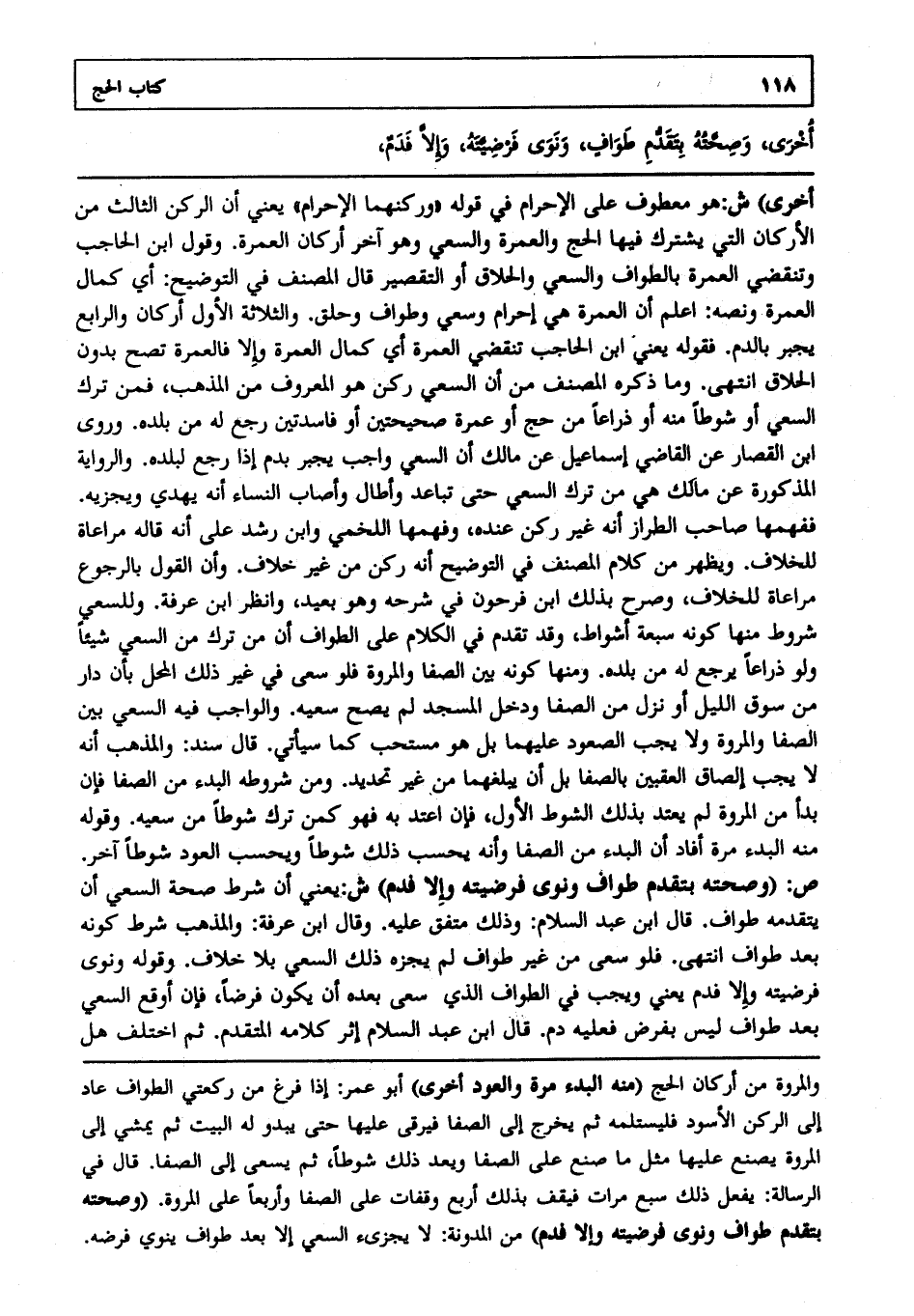 أخرى" ش: هو معطوف على الإحرام في قوله "وركنهما الإحرام" يعني أن الركن الثالث من الأركان التي يشترك فيها الحج والعمرة والسعي وهو آخر أركان العمرة. وقول ابن الحاجب وتنقضي العمرة بالطواف والسعي والحلاق أو التقصير قال المصنف في التوضيح أي كمال العمرة ونصه اعلم أن العمرة هي إحرام وسعي وطواف وحلق. والثلاثة الأول أركان والرابع يجبر بالدم. فقوله يعني ابن الحاجب تنقضي العمرة أي كمال العمرة وإلا فالعمرة تصح بدون الحلاق انتهى. وما ذكره المصنف من أن السعي ركن هو المعروف من المذهب فمن ترك السعي أو شوطا منه أو ذراعا من حج أو عمرة صحيحتين أو فاسدتين رجع له من بلده. وروى ابن القصار عن القاضي إسماعيل عن مالك أن السعي واجب يجبر بدم إذا رجع لبلده. والرواية المذكورة عن مالك هي من ترك السعي حتى تباعد وأطال وأصاب النساء أنه يهدي ويجزيه. ففهمها صاحب الطراز أنه غير ركن عنده وفهمها اللخمي وابن رشد على أنه قاله مراعاة للخلاف. ويظهر من كلام المصنف في التوضيح أنه ركن من غير خلاف. وأن القول بالرجوع مراعاة للخلاف وصرح بذلك ابن فرحون في شرحه وهو بعيد وانظر ابن عرفة. وللسعي شروط منها كونه سبعة أشواط وقد تقدم في الكلام على الطواف أن من ترك من السعي شيئا ولو ذراعا يرجع له من بلده. ومنها كونه بين الصفا والمروة فلو سعى في غير ذلك المحل بأن دار من سوق الليل أو نزل من الصفا ودخل المسجد لم يصح سعيه. والواجب فيه السعي بين الصفا والمروة ولا يجب الصعود عليهما بل هو مستحب كما سيأتي. قال سند والمذهب أنه لا يجب إلصاق العقبين بالصفا بل أن يبلغهما من غير تحديد. ومن شروطه البدء من الصفا فإن بدأ من المروة لم يعتد بذلك الشوط الأول فإن اعتد به فهو كمن ترك شوطا من سعيه. وقوله منه البدء مرة أفاد أن البدء من الصفا وأنه يحسب ذلك شوطا ويحسب العود شوطا آخر. ص: "وصحته بتقدم طواف ونوى فرضيته وإلا فدم" ش: يعني أن شرط صحة السعي أن يتقدمه طواف. قال ابن عبد السلام وذلك متفق عليه. وقال ابن عرفة والمذهب شرط كونه بعد طواف انتهى. فلو سعى من غير طواف لم يجزه ذلك السعي بلا خلاف. وقوله ونوى فرضيته وإلا فدم يعني ويجب في الطواف الذي سعى بعده أن يكون فرضا فإن أوقع السعي بعد طواف ليس بفرض فعليه دم. قال ابن عبد السلام إثر كلامه المتقدم. ثم اختلف هل