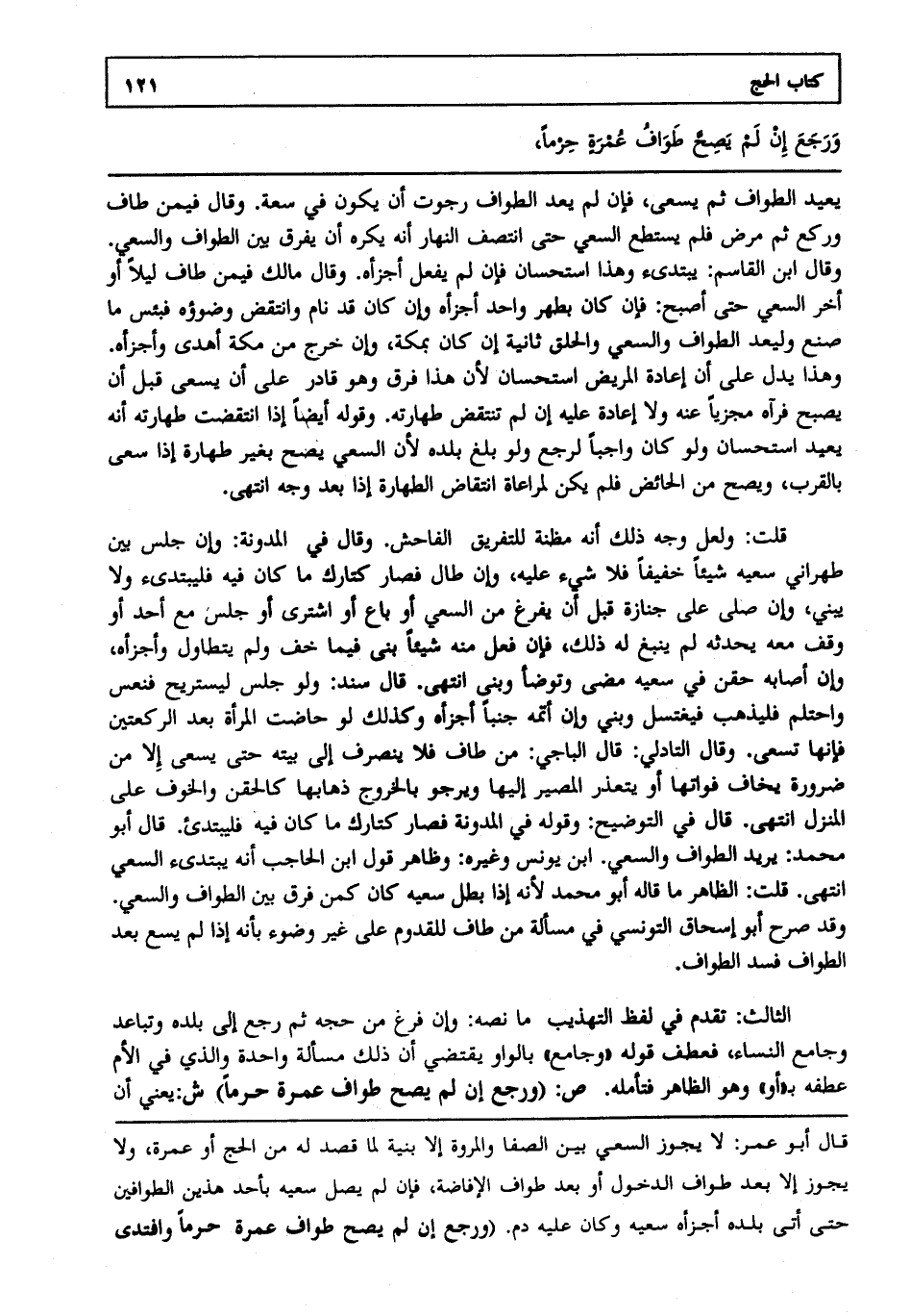 الثالث: تقدم في لفظ التهذيب ما نصه وإن فرغ من حجه ثم رجع إلى بلده وتباعد وجامع النساء فعطف قوله "وجامع" بالواو يقتضي أن ذلك مسألة واحدة والذي في الأم عطفه بأو وهو الظاهر فتأمله. ص: "ورجع إن لم يصح طواف عمرته حرما" ش: يعني أن