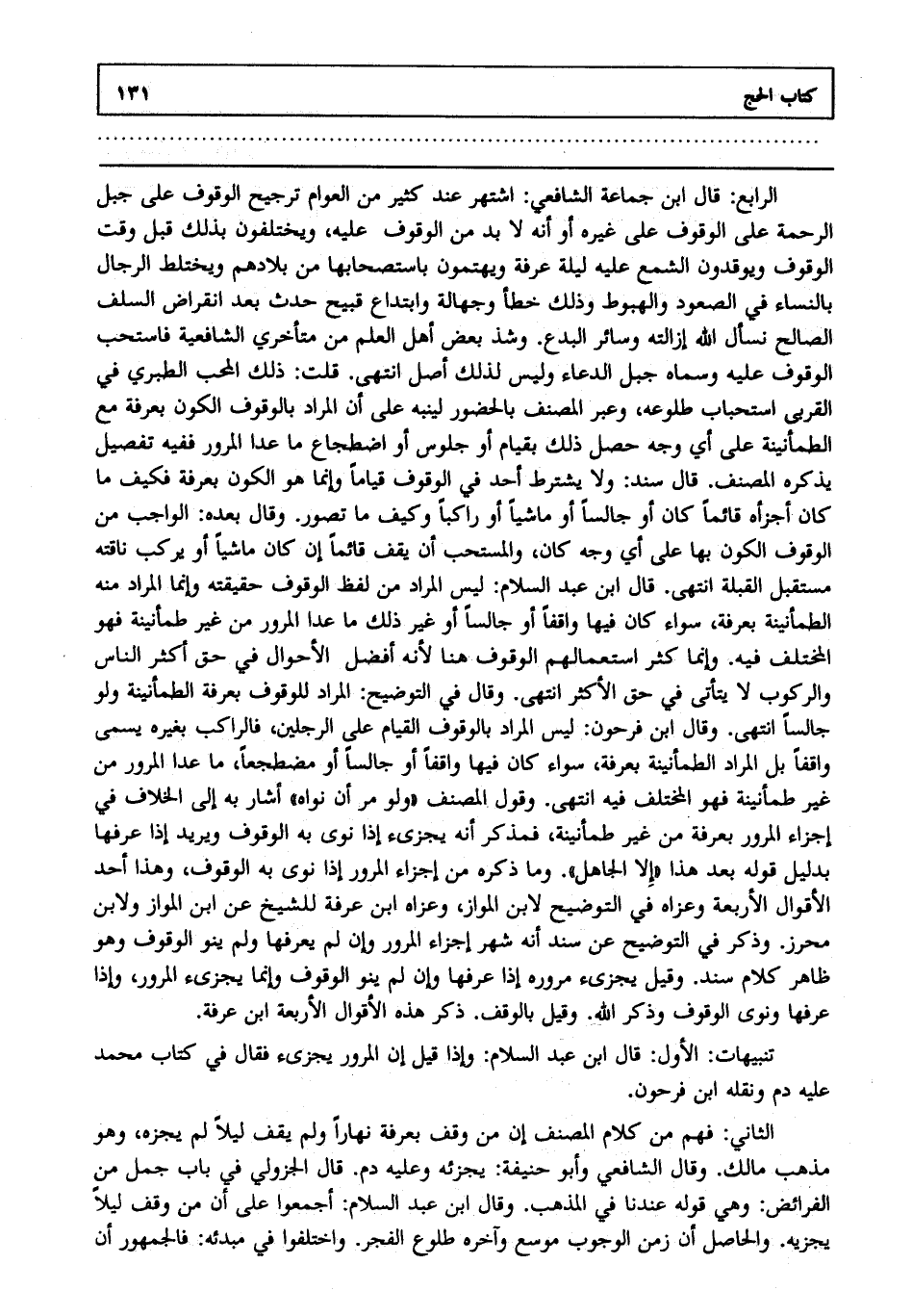 الرابع: قال ابن جماعة الشافعي اشتهر عند كثير من العوام ترجيح الوقوف على جبل الرحمة على الوقوف على غيره أو أنه لا بد من الوقوف عليه ويختلفون بذلك قبل وقت الوقوف ويوقدون الشمع عليه ليلة عرفة ويهتمون باستصحابها من بلادهم ويختلط الرجال بالنساء في الصعود والهبوط وذلك خطأ وجهالة وابتداع قبيح حدث بعد انقراض السلف الصالح نسأل الله إزالته وسائر البدع. وشذ بعض أهل العلم من متأخري الشافعية فاستحب الوقوف عليه وسماه جبل الدعاء وليس لذلك أصل انتهى. قلت: ذكر المحب الطبري في القربى استحباب طلوعه وعبر المصنف بالحضور لينبه على أن المراد بالوقوف الكون بعرفة مع الطمأنينة على أي وجه حصل ذلك بقيام أو جلوس أو اضطجاع ما عدا المرور ففيه تفصيل يذكره المصنف. قال سند ولا يشترط أحد في الوقوف قياما وإنما هو الكون بعرفة فكيف ما كان أجزأه قائما كان أو جالسا أو ماشيا أو راكبا وكيف ما تصور. وقال بعده الواجب من الوقوف الكون بها على أي وجه كان والمستحب أن يقف قائما إن كان ماشيا أو يركب ناقته مستقبل القبلة انتهى. قال ابن عبد السلام ليس المراد من لفظ الوقوف حقيقته وإنما المراد منه الطمأنينة بعرفة سواء كان فيها واقفا أو جالسا أو غير ذلك ما عدا المرور من غير طمأنينة فهو المختلف فيه. وإنما كثر استعمالهم الوقوف هنا لأنه أفضل الأحوال في حق أكثر الناس والركوب لا يتأتى في حق الأكثر انتهى. وقال في التوضيح المراد للوقوف بعرفة الطمأنينة ولو جالسا انتهى. وقال ابن فرحون ليس المراد بالوقوف القيام على الرجلين فالراكب بغيره يسمى واقفا بل المراد الطمأنينة بعرفة سواء كان فيها واقفا أو جالسا أو مضطجعا ما عدا المرور من غير طمأنينة فهو المختلف فيه انتهى. وقول المصنف "ولو مر إن نواه" أشار به إلى الخلاف في إجزاء المرور بعرفة من غير طمأنينة فمذكر أنه يجزئ إذا نوى به الوقوف ويريد إذا عرفها بدليل قوله بعد هذا إلا الجاهل. وما ذكره من إجزاء المرور إذا نوى به الوقوف وهذا أحد الأقوال الأربعة وعزاه في التوضيح لابن المواز وعزاه ابن عرفة للشيخ عن ابن المواز ولابن محرز. وذكر في التوضيح عن سند أنه شهر إجزاء المرور وإن لم يعرفها ولم ينو الوقوف وهو ظاهر كلام سند. وقيل يجزئ مروره إذا عرفها وإن لم ينو الوقوف وإنما يجزئ المرور وإذا عرفها ونوى الوقوف وذكر الله وقيل بالوقف ذكر هذه الأقوال الأربعة ابن عرفة.