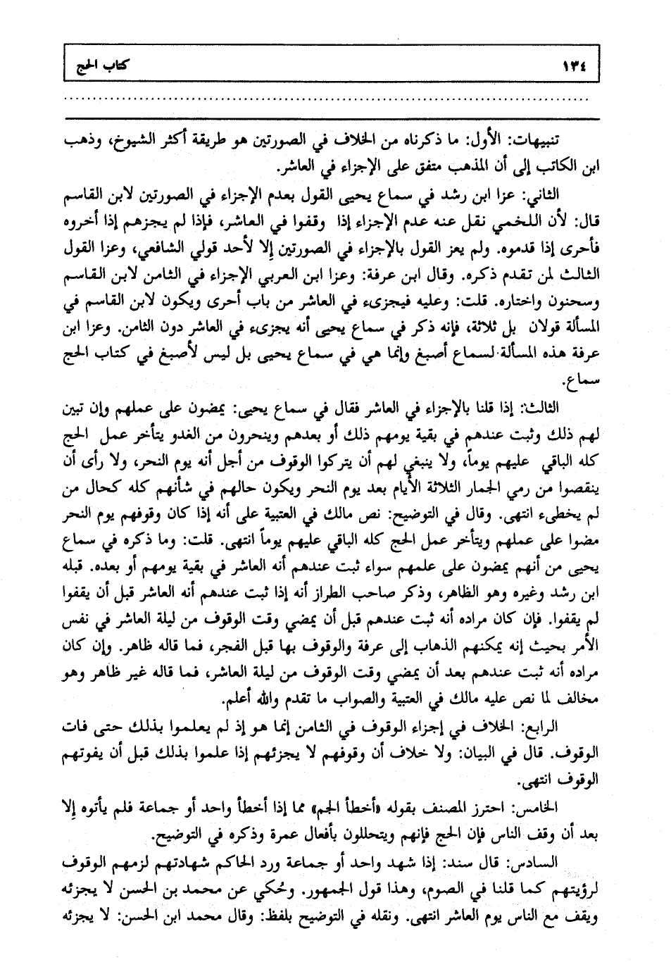 الثاني: عزا ابن رشد في سماع يحيى القول بعدم الإجزاء في الصورتين لابن القاسم قال لأن اللخمي نقل عنه عدم الإجزاء إذا وقفوا في العاشر فإذا لم يجزهم إذا أخروه فأحرى إذا قدموه. ولم يعز القول بالإجزاء في الصورتين إلا لأحد قولي الشافعي وعزا القول الثالث لمن تقدم ذكره . وقال ابن عرفة وعزا ابن العربي الإجزاء في الثامن لابن القاسم وسحنون واختاره. قلت: وعليه فيجزئ في العاشر من باب أحرى ويكون لابن القاسم في المسألة قولان بل ثلاثة فإنه ذكر في سماع يحيى أنه يجزئ في العاشر دون الثامن. وعزا ابن عرفة هذه المسألة لسماع أصبغ وإنما هي في سماع يحيى بل ليس لأصبغ في كتاب الحج سماع.