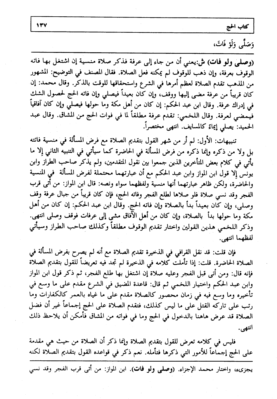 تنبيهات: الأول: لم أر من شهر القول بتقديم الصلاة مع فرض المسألة في منسية فاتته بل ولا من ذكره وإنما ذكره من فرض المسألة في الحاضرة كما سيأتي في التنبيه الثاني إلا ما يأتي في كلام بعض المتأخرين الذين جمعوا بين نقول المتقدمين ولم يذكر صاحب الطراز وابن يونس إلا قول ابن المواز وابن عبد الحكم مع أن عبارتهما محتملة لفرض المسألة في المنسية والحاضرة ولكن ظاهر عبارتهما أنها منسية ولفظهما سواء ونصه قال ابن المواز من أتى قرب الفجر وقد نسي صلاة فلو صلاها لطلع الفجر وفاته الحج فإن كان قريبا من جبال عرفة وقف وصلى وإن كان بعيدا بدأ بالصلاة وإن فاته الحج. وقال ابن عبد الحكم إن كان من أهل مكة وما حولها بدأ بالصلاة وإن كان من أهل الآفاق مشى إلى عرفات فوقف وصلى انتهى. وذكر اللخمي هذين القولين واختار تقديم الوقوف مطلقا وكذلك صاحب الطراز وسيأتي لفظهما انتهى.