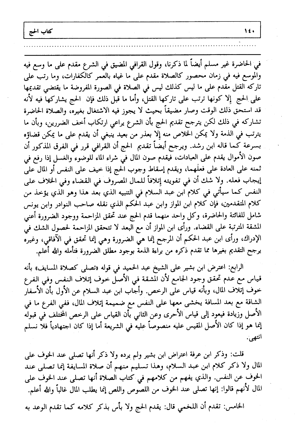 في الحاضرة غير مسلم أيضا لما ذكرنا وقول القرافي المضيق في الشرع مقدم على ما وسع فيه والموسع فيه في زمان محصور كالصلاة مقدم على ما غياه بالعمر كالكفارات وما رتب على تاركه القتل مقدم على ما ليس كذلك ليس في الصلاة في الصورة المفروضة ما يقتضي تقديمها على الحج إلا كونها ترتب على تاركها القتل وأما ما قبل ذلك فإن الحج يشاركها فيه لأنه قد استحق ذلك الوقت وصار مضيقا بحيث لا يجوز فيه الاشتغال بغيره والصلاة الحاضرة تشاركه في ذلك لكن يترجح تقديم الحج بأن الشرع يراعي ارتكاب أخف الضررين وبأن ما يترتب في الذمة ولا يمكن الخلاص منه إلا بعذر من بعيد ينبغي أن يقدم على ما يمكن قضاؤه بسرعة كما قاله ابن رشد. ويرجح أيضا تقديم الحج أن القرافي قرر في الفرق المذكور أن صون الأموال يقدم على العبادات فيقدم صون المال في شراء الماء للوضوء والغسل إذا رفع في ثمنه على العادة على فعلهما ويقدم إسقاط وجوب الحج إذا خيف على النفس أو المال على إيجاب فعله. ولا شك أن في تفويته إتلافا للمال المصروف في القضاء وفي الخلاف على النفس كما سيأتي في كلام ابن عبد السلام في التنبيه الذي بعد هذا وهو الذي يؤخذ من كلام المتقدمين فإن كلام ابن المواز وابن عبد الحكم الذي نقله صاحب النوادر وابن يونس شامل للفائتة والحاضرة وكل واحد منهما قدم الحج عند تحقق المزاحمة ووجود الضرورة أعني المشقة المترتبة على القضاء. ورأى ابن المواز أن مع البعد لا تتحقق المزاحمة لحصول الشك في الإدراك ورأى ابن عبد الحكم أن المرجح إنما هي الضرورة وهي إنما تحقق في الآفاقي وغيره يرجح التقديم بغيرها مما تقدم ذكره من براءة الذمة بوجود مطلق الضرورة فتأمله والله أعلم.