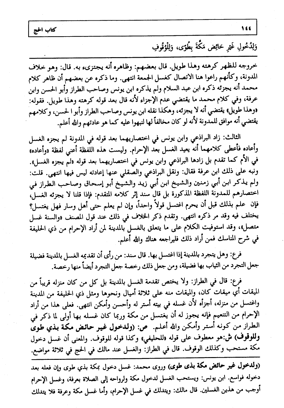 فرع: قال في الطراز ولا يختص تقدمة الغسل بالمدينة بل كل من كان منزله قريبا من الميقات أي ميقات كان والميقات منه على ثلاثة أميال ونحوها ومثل ذي الحليفة من المدينة واغتسل من منزله أجزأه لأن غسله في بيته أستر له وأحسن وأمكن انتهى. فعلى هذا من أراد الإحرام من التنعيم فإنه يجوز له أن يغتسل من مكة وربما كان غسله بها أولى لما ذكر في الطراز من كونه أستر وأمكن والله أعلم. ص: ولدخول غير حائض مكة بذي طوى وللوقوف ش: هو معطوف على قوله للحليفي وكذا قوله للوقوف. والمعنى أن غسل دخول مكة مستحب وكذلك الوقوف. قال في الطراز والغسل عند مالك في الحج في ثلاثة مواضع
