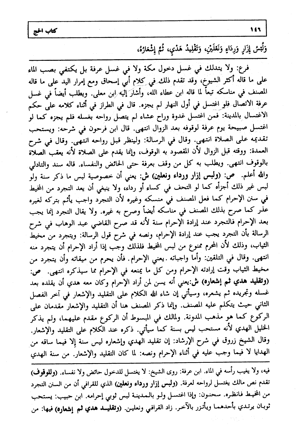 فرع: ولا يتدلك في غسل دخول مكة ولا في غسل عرفة بل يكتفي بصب الماء على ما قاله أكثر الشيوخ وقد تقدم ذلك في كلام أبي إسحاق ومع إمرار اليد على ما قاله المصنف في مناسكه تبعا لما قاله ابن عطاء الله وأشار إليه ابن معلى. ويطلب أيضا في غسل عرفة الاتصال فلو اغتسل في أول النهار لم يجزه. قال في الطراز في أثناء كلامه على حكم الاغتسال بالمدينة فمن اغتسل غدوة وراح عشاء لم يتصل رواحه بغسله فلم يجزه كما لو اغتسل صبيحة يوم عرفة لوقوفه بعد الزوال انتهى. قال ابن فرحون في شرحه ويستحب تقديمه على الصلاة انتهى. وقال في الرسالة ولينظر قبل رواحه انتهى. وقال في شرح العمدة ووقته قبل الزوال لأن المقصود به الوقوف وإنما يقدم على الصلاة لأنه يعقب الصلاة بالوقوف انتهى. ويطلب به كل من وقف بعرفة حتى الحائض والنفساء. قاله سند والتادلي والله أعلم. ص: "ولبس إزار ورداء ونعلين" ش: يعني أن خصوصية لبس ما ذكر سنة ولو لبس غير ذلك أجزأه كما لو التحف في كساء أو رداء ولا ينبغي أن يعد التجرد من المخيط في سنن الإحرام كما فعل المصنف في منسكه وغيره لأن التجرد واجب يأثم بتركه لغير عذر كما صرح بذلك المصنف في مناسكه أيضا وصرح به غيره. ولا يقال التجرد إنما يجب بعد الإحرام فالتجرد عند إرادة الإحرام سنة لأنه قد صرح القاضي عبد الوهاب في شرح الرسالة بأن التجرد يجب عند إرادة الإحرام ونصه في شرح قول الرسالة ويتجرد من مخيط الثياب وذلك لأن المحرم ممنوع من لبس المخيط فلذلك وجب إذا أراد الإحرام أن يتجرد منه انتهى. وقال في التلقين وأما واجباته يعني الإحرام فأن يحرم من ميقاته وأن يتجرد من مخيط الثياب وقت إرادته الإحرام ومن كل ما يمنعه في الإحرام مما سيذكره انتهى. ص: "وتقليد هدي ثم إشعاره" ش: يعني أنه يسن لمن أراد الإحرام وكان معه هدي أن يقلده بعد غسله وتجريده ثم يشعره وسيأتي إن شاء الله الكلام على التقليد والإشعار في آخر الفصل الثاني حيث يتكلم عليه المصنف. وإنما ذكر المصنف هنا أن التقليد والإشعار مقدمان على الركوع كما هو مذهب المدونة. ولمالك في المبسوط أن الركوع مقدم عليهما ولم يذكر الخليل الهدي لأنه مستحب ليس بسنة كما سيأتي. ذكره عند الكلام على التقليد والإشعار. وقال الشيخ زروق في شرح الإرشاد إن تقليد الهدي وإشعاره ليس سنة إلا فيما ساقه من الهدايا لا فيما وجب عليه في أثناء الإحرام ونصه لما كان التقليد والإشعار من سنة الهدي