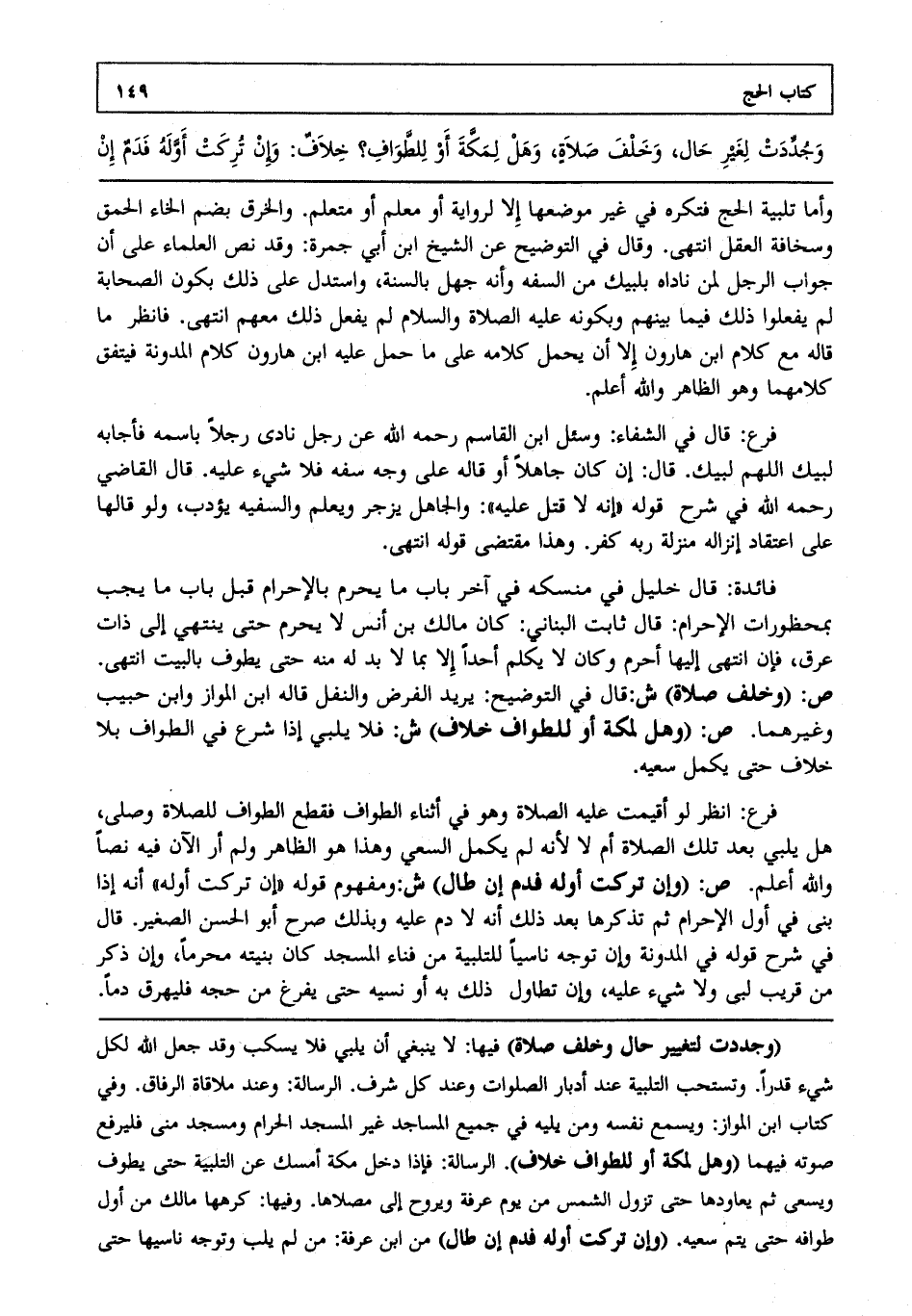 وأما تلبية الحج فتكره في غير موضعها إلا لرواية أو معلم أو متعلم. والخرق بضم الخاء الحمق وسخافة العقل انتهى. وقال في التوضيح عن الشيخ ابن أبي جمرة وقد نص العلماء على أن جواب الرجل لمن ناداه بلبيك من السفه وأنه جهل بالسنة واستدل على ذلك بكون الصحابة لم يفعلوا ذلك فيما بينهم وبكونه عليه الصلاة والسلام لم يفعل ذلك معهم انتهى. فانظر ما قاله مع كلام ابن هارون إلا أن يحمل كلامه على ما حمل عليه ابن هارون كلام المدونة فيتفق كلامهما وهو الظاهر والله أعلم.
