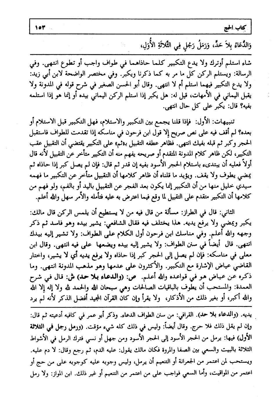الثاني: قال في الطراز مسألة من قال فيه من لا يستطيع أن يلمس الركن قال مالك يكبر ويمضي ولا يرفع يديه. هذا يختلف فيه فقال الشافعي يشير بيده وهو فاسد ثم ذكر وجهه والله أعلم. وفي مناسك ابن فرحون أول الكلام على الطواف ولا تشير إليه بيدك انتهى. قال أيضا في سنن الطواف ولا يشير إليه بيده ويضعها على فيه انتهى. وقال ابن معلى في مناسكه فإن لم يصل إلى الحجر كبر إذا حاذاه ولا يرفع يديه أي لا يشير واختار القاضي عياض الإشارة مع التكبير. والأكثرون على عدمها وهو مذهب المدونة انتهى. وما ذكره عن عياض هو في قواعده والله أعلم. ص: "والدعاء بلا حد" ش: قال في شرح العمدة والمستحب أن يطوف بالباقيات الصالحات وهي سبحان الله والحمد لله ولا إله إلا الله والله أكبر أو بغير ذلك من الأذكار ولا يقرأ وإن كان القرآن المجيد أفضل الذكر لأنه لم يرد
