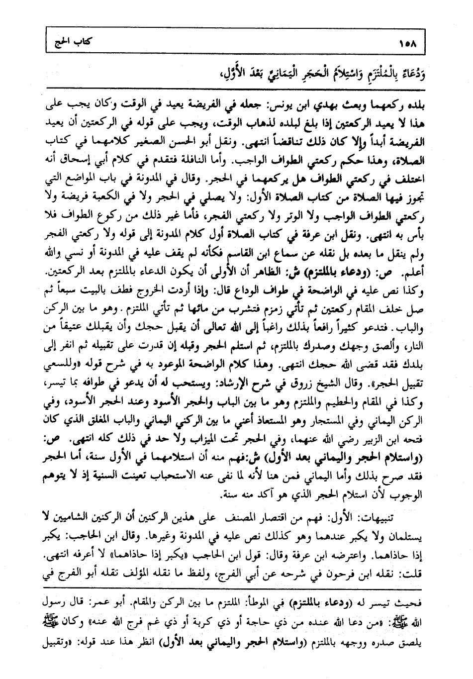 بلده ركعهما وبعث بهدي ابن يونس جعله في الفريضة يعيد في الوقت وكان يجب على هذا لا يعيد الركعتين إذا بلغ لبلده لذهاب الوقت ويجب على قوله في الركعتين أن يعيد الفريضة أبدا وإلا كان ذلك تناقضا انتهى. ونقل أبو الحسن الصغير كلامهما في كتاب الصلاة وهذا حكم ركعتي الطواف الواجب. وأما النافلة فتقدم في كلام أبي إسحاق أنه اختلف في ركعتي الطواف هل يركعهما في الحجر. وقال في المدونة في باب المواضع التي تجوز فيها الصلاة من كتاب الصلاة الأول ولا يصلي في الحجر ولا في الكعبة فريضة ولا ركعتي الطواف الواجب ولا الوتر ولا ركعتي الفجر فأما غير ذلك من ركوع الطواف فلا بأس به انتهى. ونقل ابن عرفة في كتاب الصلاة أول كلام المدونة إلى قوله ولا ركعتي الفجر ولم ينقل ما بعده بل نقله عن سماع ابن القاسم فكأنه لم يقف عليه في المدونة أو نسي والله أعلم. ص: "ودعاء بالملتزم" ش: الظاهر أن الأولى أن يكون الدعاء بالملتزم بعد الركعتين. وكذا نص عليه في الواضحة في طواف الوداع قال وإذا أردت الخروج فطف بالبيت سبعا ثم صل خلف المقام ركعتين ثم تأتي زمزم فتشرب من مائها ثم تأتي الملتزم وهو ما بين الركن والباب فتدعو كثيرا رافعا بذلك راغبا إلى الله تعالى أن يقبل حجك وأن يقبلك عتيقا من النار وألصق وجهك وصدرك بالملتزم ثم استلم الحجر وقبله إن قدرت على تقبيله ثم انفر إلى بلدك فقد قضى الله حجك انتهى. وهذا كلام الواضحة الموعود به في شرح قوله "وللسعي تقبيل الحجر". وقال الشيخ زروق في شرح الإرشاد ويستحب له أن يدعو في طوافه بما تيسر وكذا في المقام والحطيم والملتزم وهو ما بين الباب والحجر الأسود وعند الحجر الأسود وفي الركن اليماني وفي المستجار وهو المستعاذ أعني ما بين الركني اليماني والباب المغلق الذي كان فتحه ابن الزبير رضي الله عنهما وفي الحجر تحت الميزاب ولا حد في ذلك كله انتهى. ص: "واستلام الحجر واليماني بعد الأول" ش: فهم منه أن استلامهما في الأول سنة أما الحجر فقد صرح بذلك وأما اليماني فمن هنا لأنه لما نفى عنه الاستحباب تعينت السنية إذ لا يتوهم الوجوب لأن استلام الحجر الذي هو آكد منه سنة.