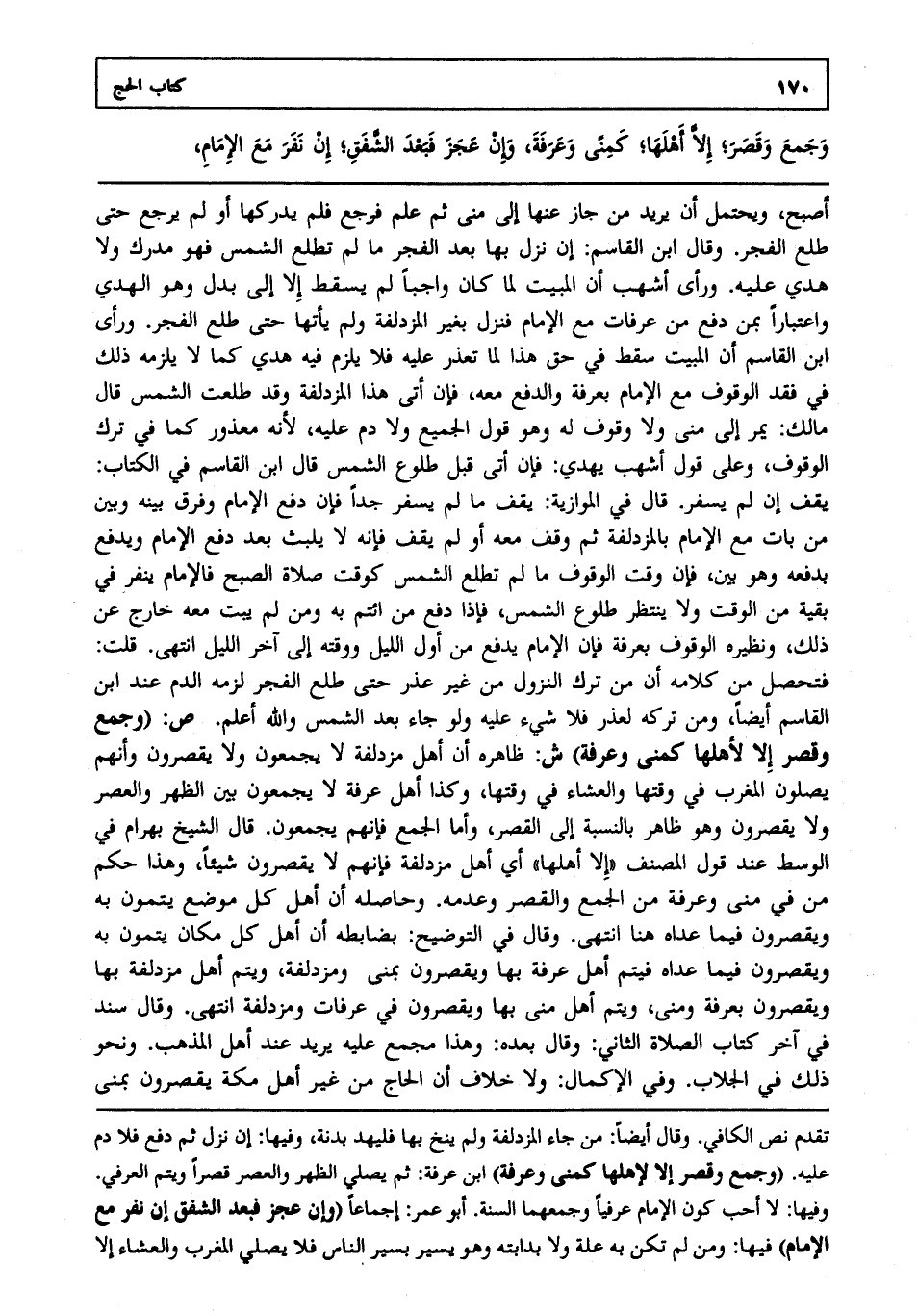 أصبح ويحتمل أن يريد من جاز عنها إلى منى ثم علم فرجع فلم يدركها أو لم يرجع حتى طلع الفجر. وقال ابن القاسم إن نزل بها بعد الفجر ما لم تطلع الشمس فهو مدرك ولا هدي عليه. ورأى أشهب أن المبيت لما كان واجبا لم يسقط إلا إلى بدل وهو الهدي واعتبارا بمن دفع من عرفات مع الإمام فنزل بغير المزدلفة ولم يأتها حتى طلع الفجر. ورأى ابن القاسم أن المبيت سقط في حق هذا لما تعذر عليه فلا يلزم فيه هدي كما لا يلزمه ذلك في فقد الوقوف مع الإمام بعرفة والدفع معه فإن أتى هذا المزدلفة وقد طلعت الشمس قال مالك يمر إلى منى ولا وقوف له وهو قول الجميع ولا دم عليه لأنه معذور كما في ترك الوقوف وعلى قول أشهب يهدي فإن أتى قبل طلوع الشمس قال ابن القاسم في الكتاب يقف إن لم يسفر. قال في الموازية يقف ما لم يسفر جدا فإن دفع الإمام وفرق بينه وبين من بات مع الإمام بالمزدلفة ثم وقف معه أو لم يقف فإنه لا يلبث بعد دفع الإمام ويدفع بدفعه وهو بين فإن وقت الوقوف ما لم تطلع الشمس كوقت صلاة الصبح فالإمام ينفر في بقية من الوقت ولا ينتظر طلوع الشمس فإذا دفع من ائتم به ومن لم يبت معه خارج عن ذلك ونظيره الوقوف بعرفة فإن الإمام يدفع من أول الليل ووقته إلى آخر الليل انتهى. قلت: فتحصل من كلامه أن من ترك النزول من غير عذر حتى طلع الفجر لزمه الدم عند ابن القاسم أيضا ومن تركه لعذر فلا شيء عليه ولو جاء بعد الشمس والله أعلم. ص: "وجمع وقصر إلا لأهلها كمنى وعرفة" ش: ظاهره أن أهل مزدلفة لا يجمعون ولا يقصرون وأنهم يصلون المغرب في وقتها والعشاء في وقتها وكذا أهل عرفة لا يجمعون بين الظهر والعصر ولا يقصرون وهو ظاهر بالنسبة إلى القصر وأما الجمع فإنهم يجمعون. قال الشيخ بهرام في الوسط عند قول المصنف "إلا أهلها" أي أهل مزدلفة فإنهم لا يقصرون شيئا وهذا حكم من في منى وعرفة من الجمع والقصر وعدمه. وحاصله أن أهل كل موضع يتمون به ويقصرون فيما عداه هنا انتهى. وقال في التوضيح بضابطه أن أهل كل مكان يتمون به ويقصرون فيما عداه فيتم أهل عرفة بها ويقصرون بمنى ومزدلفة ويتم أهل مزدلفة بها ويقصرون بعرفة ومنى ويتم أهل منى بها ويقصرون في عرفات ومزدلفة انتهى. وقال سند في آخر كتاب الصلاة الثاني وقال بعده وهذا مجمع عليه يريد عند أهل المذهب. ونحو ذلك في الجلاب. وفي الإكمال ولا خلاف أن الحاج من غير أهل مكة يقصرون بمنى