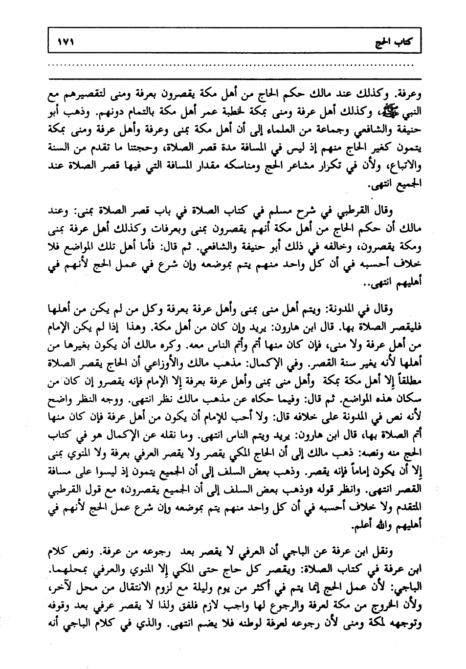 ونقل ابن عرفة عن الباجي أن العرفي لا يقصر بعد رجوعه من عرفة. ونص كلام ابن عرفة في كتاب الصلاة ويقصر كل حاج حتى المكي إلا المنوي والعرفي بمحلهما. الباجي لأن عمل الحج إنما يتم في أكثر من يوم وليلة مع لزوم الانتقال من محل لآخر ولأن الخروج من مكة لعرفة والرجوع لها واجب لازم فلفق ولذا لا يقصر عرفي بعد وقوفه وتوجهه لمكة ومنى لأن رجوعه لعرفة لوطنه فلا يضم انتهى. والذي في كلام الباجي أنه