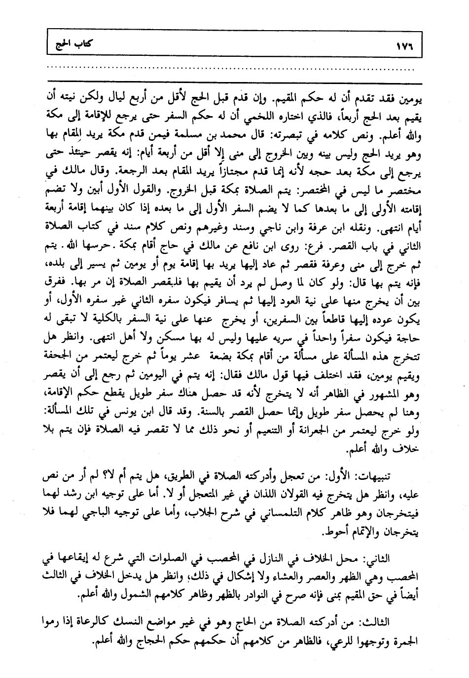 تنبيهات: الأول: من تعجل وأدركته الصلاة في الطريق هل يتم أم لا لم أر من نص عليه وانظر هل يتخرج فيه القولان اللذان في غير المتعجل أو لا. أما على توجيه ابن رشد لهما فيتخرجان وهو ظاهر كلام التلمساني في شرح الجلاب وأما على توجيه الباجي لهما فلا يتخرجان والإتمام أحوط.