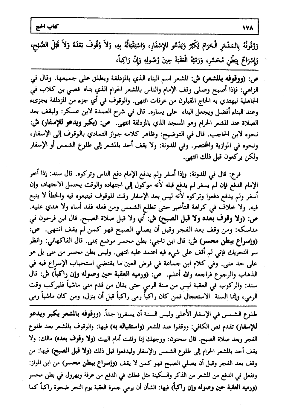 ووقوفه بالمشعر الحرام يكبر ويدعو للإسفار واستقباله به ولا وقوف بعده ولا قبل الصبح وإسراع ببطن محسر ورمي العقبة حين وصوله وإن راكبا