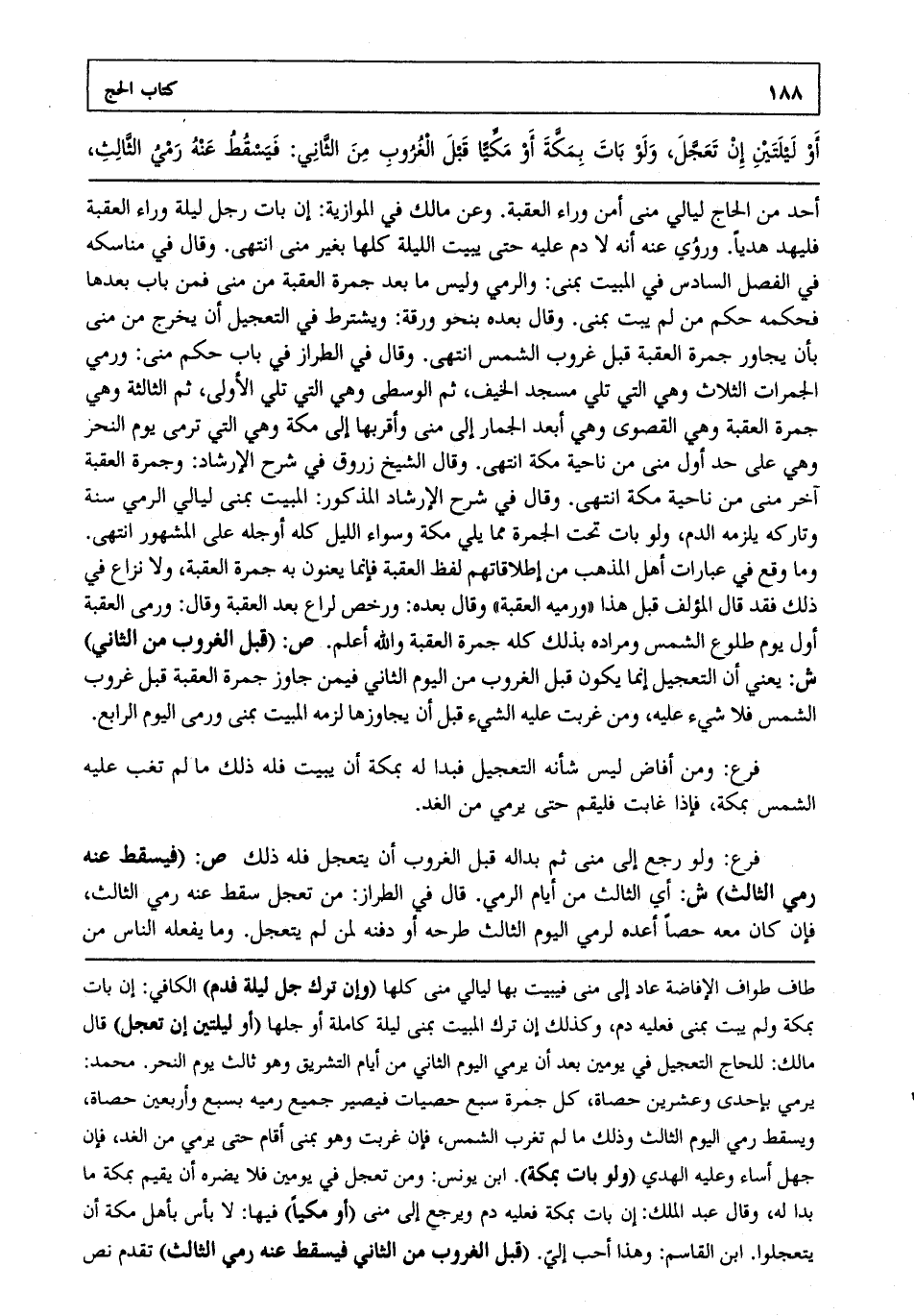 أحد من الحاج ليالي منى أمن وراء العقبة. وعن مالك في الموازية إن بات رجل ليلة وراء العقبة فليهد هديا. وروي عنه أنه لا دم عليه حتى يبيت الليلة كلها بغير منى انتهى. وقال في مناسكه في الفصل السادس: في المبيت بمنى والرمي وليس ما بعد جمرة العقبة من منى فمن بات بعدها فحكمه حكم من لم يبت بمنى. وقال بعده بنحو ورقة ويشترط في التعجيل أن يخرج من منى بأن يجاور جمرة العقبة قبل غروب الشمس انتهى. وقال في الطراز في باب حكم منى ورمي الجمرات الثلاث وهي التي تلي مسجد الخيف ثم الوسطى وهي التي تلي الأولى ثم الثالثة وهي جمرة العقبة وهي القصوى وهي أبعد الجمار إلى منى وأقربها إلى مكة وهي التي ترمى يوم النحر وهي على حد أول منى من ناحية مكة انتهى. وقال الشيخ زروق في شرح الإرشاد وجمرة العقبة آخر منى من ناحية مكة انتهى. وقال في شرح الإرشاد المذكور المبيت بمنى ليالي الرمي سنة وتاركه يلزمه الدم ولو بات تحت الجمرة مما يلي مكة وسواء الليل كله أوجله على المشهور انتهى. وما وقع في عبارات أهل المذهب من إطلاقاتهم لفظ العقبة فإنما يعنون به جمرة العقبة ولا نزاع في ذلك فقد قال المؤلف قبل هذا "ورميه العقبة" وقال بعده ورخص لراع بعد العقبة وقال ورمى العقبة أول يوم طلوع الشمس ومراده بذلك كله جمرة العقبة والله أعلم. ص: "قبل الغروب من الثاني" ش: يعني أن التعجيل إنما يكون قبل الغروب من اليوم الثاني فيمن جاوز جمرة العقبة قبل غروب الشمس فلا شيء عليه ومن غربت عليه الشمس قبل أن يجاوزها لزمه المبيت بمنى ورمى اليوم الرابع.