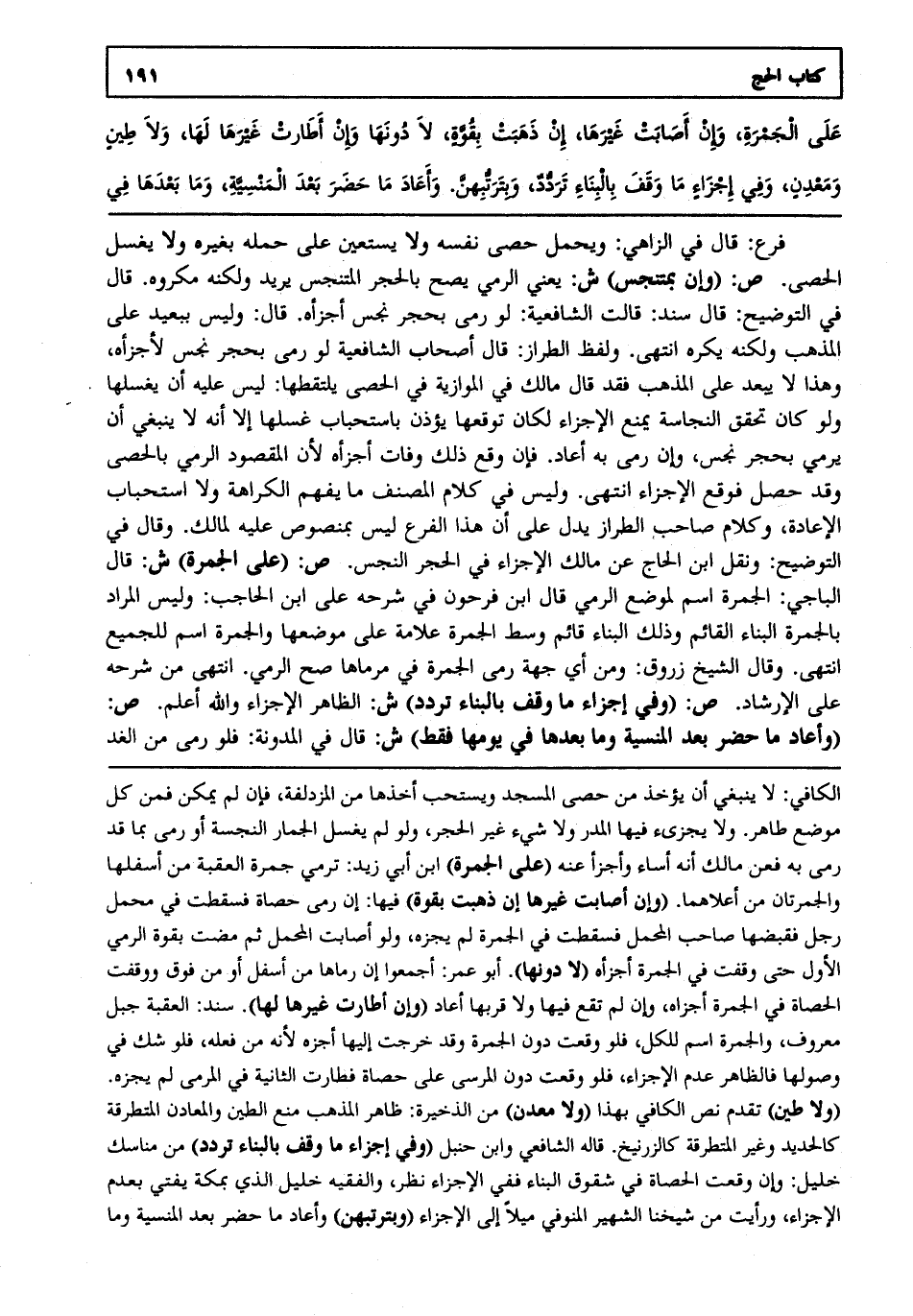 فرع: قال في الزاهي ويحمل حصى نفسه ولا يستعين على حمله بغيره ولا يغسل الحصى. ص: "وإن بمتنجس" ش: يعني الرمي يصح بالحجر المتنجس يريد ولكنه مكروه. قال في التوضيح قال سند قالت الشافعية لو رمى بحجر نجس أجزأه. قال وليس ببعيد على المذهب ولكنه يكره انتهى. ولفظ الطراز قال أصحاب الشافعية لو رمى بحجر نجس لأجزأه وهذا لا يبعد على المذهب فقد قال مالك في الموازية في الحصى يلتقطها ليس عليه أن يغسلها ولو كان تحقق النجاسة يمنع الإجزاء لكان توقعها يؤذن باستحباب غسلها إلا أنه لا ينبغي أن يرمي بحجر نجس وإن رمى به أعاد. فإن وقع ذلك وفات أجزأه لأن المقصود الرمي بالحصى وقد حصل فوقع الإجزاء انتهى. وليس في كلام المصنف ما يفهم الكراهة ولا استحباب الإعادة وكلام صاحب الطراز يدل على أن هذا الفرع ليس بمنصوص عليه لمالك. وقال في التوضيح ونقل ابن الحاج عن مالك الإجزاء في الحجر النجس. ص: "على الجمرة" ش: قال الباجي الجمرة اسم لموضع الرمي قال ابن فرحون في شرحه على ابن الحاجب وليس المراد بالجمرة البناء القائم وذلك البناء قائم وسط الجمرة علامة على موضعها والجمرة اسم للجميع انتهى. وقال الشيخ زروق ومن أي جهة رمى الجمرة في مرماها صح الرمي. انتهى من شرحه على الإرشاد. ص: "وفي إجزاء ما وقف بالبناء تردد" ش: الظاهر الإجزاء والله أعلم. ص: "وأعاد ما حضر بعد المنسية وما بعدها في يومها فقط" ش: قال في المدونة فلو رمى من الغد