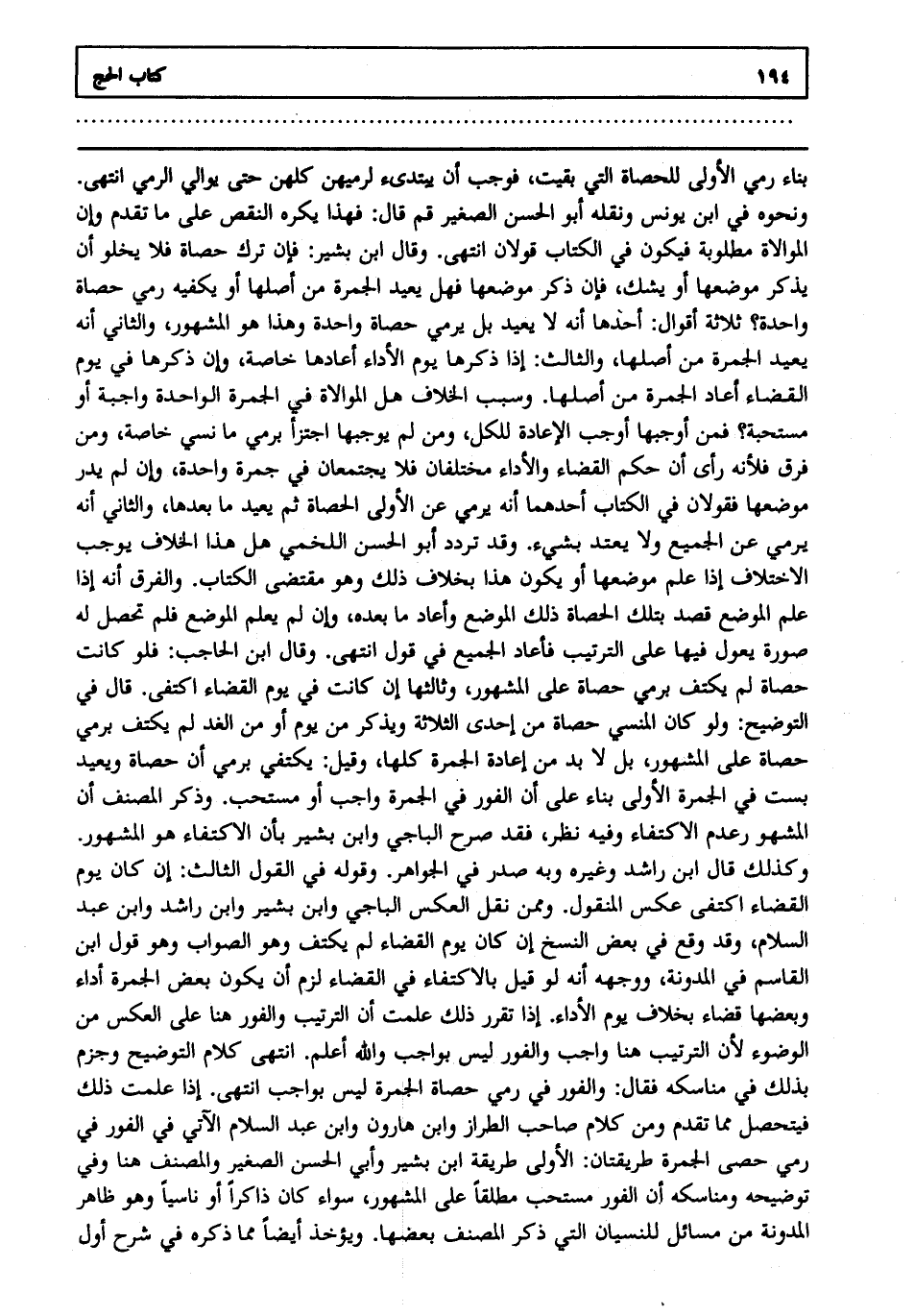 بناء رمي الأولى للحصاة التي بقيت فوجب أن يبتدئ لرميهن كلهن حتى يوالي الرمي انتهى. ونحوه في ابن يونس ونقله أبو الحسن الصغير ثم قال فهذا يكره النقص على ما تقدم وإن الموالاة مطلوبة فيكون في الكتاب قولان انتهى. وقال ابن بشير فإن ترك حصاة فلا يخلو أن يذكر موضعها أو يشك فإن ذكر موضعها فهل يعيد الجمرة من أصلها أو يكفيه رمي حصاة واحدة ثلاثة أقوال أحدها أنه لا يعيد بل يرمي حصاة واحدة وهذا هو المشهور والثاني أنه يعيد الجمرة من أصلها والثالث إذا ذكرها يوم الأداء أعادها خاصة وإن ذكرها في يوم القضاء أعاد الجمرة من أصلها. وسبب الخلاف هل الموالاة في الجمرة الواحدة واجبة أو مستحبة فمن أوجبها أوجب الإعادة للكل ومن لم يوجبها اجتزأ برمي ما نسي خاصة ومن فرق فلأنه رأى أن حكم القضاء والأداء مختلفان فلا يجتمعان في جمرة واحدة وإن لم يدر موضعها فقولان في الكتاب أحدهما أنه يرمي عن الأولى الحصاة ثم يعيد ما بعدها والثاني أنه يرمي عن الجميع ولا يعتد بشيء. وقد تردد أبو الحسن اللخمي هل هذا الخلاف يوجب الاختلاف إذا علم موضعها أو يكون هذا بخلاف ذلك وهو مقتضى الكتاب. والفرق أنه إذا علم الموضع قصد بتلك الحصاة ذلك الموضع وأعاد ما بعده وإن لم يعلم الموضع فلم تحصل له صورة يعول فيها على الترتيب فأعاد الجميع في قول انتهى. وقال ابن الحاجب فلو كانت حصاة لم يكتف برمي حصاة على المشهور وثالثها إن كانت في يوم القضاء اكتفى. قال في التوضيح ولو كان المنسي حصاة من إحدى الثلاثة ويذكر من يوم أو من الغد لم يكتف برمي حصاة على المشهور بل لا بد من إعادة الجمرة كلها وقيل يكتفي برمي أن حصاة ويعيد بست في الجمرة الأولى بناء على أن الفور في الجمرة واجب أو مستحب. وذكر المصنف أن المشهورة عدم الاكتفاء وفيه نظر فقد صرح الباجي وابن بشير بأن الاكتفاء هو المشهور. وكذلك قال ابن راشد وغيره وبه صدر في الجواهر. وقوله في القول الثالث إن كان يوم القضاء اكتفى عكس المنقول. وممن نقل العكس الباجي وابن بشير وابن راشد وابن عبد السلام وقد وقع في بعض النسخ إن كان يوم القضاء لم يكتف وهو الصواب وهو قول ابن القاسم في المدونة ووجهه أنه لو قيل بالاكتفاء في القضاء لزم أن يكون بعض الجمرة أداء وبعضها قضاء بخلاف يوم الأداء. إذا تقرر ذلك علمت أن الترتيب والفور هنا على العكس من الوضوء لأن الترتيب هنا واجب والفور ليس بواجب والله أعلم. انتهى كلام التوضيح وجزم بذلك في مناسكه فقال والفور في رمي حصاة الجمرة ليس بواجب انتهى. إذا علمت ذلك فيتحصل مما تقدم ومن كلام صاحب الطراز وابن هارون وابن عبد السلام الآتي في الفور في رمي حصى الجمرة طريقتان الأولى طريقة ابن بشير وأبي الحسن الصغير والمصنف هنا وفي توضيحه ومناسكه أن الفور مستحب مطلقا على المشهور سواء كان ذاكرا أو ناسيا وهو ظاهر المدونة من مسائل للنسيان التي ذكر المصنف بعضها. ويؤخذ أيضا مما ذكره في شرح أول