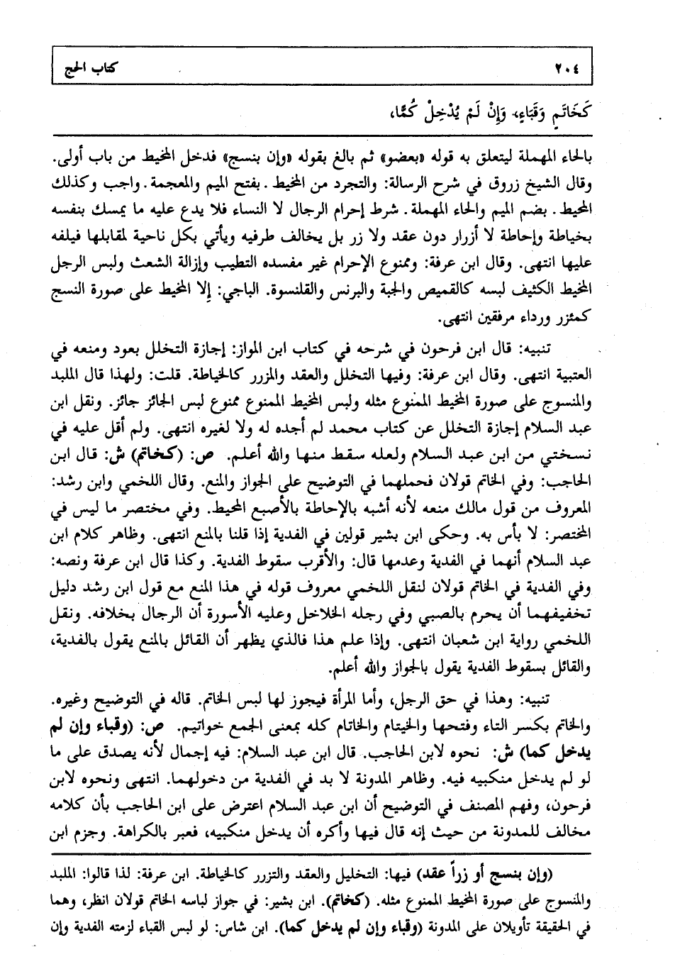 تنبيه: وهذا في حق الرجل وأما المرأة فيجوز لها لبس الخاتم. قاله في التوضيح وغيره. والخاتم بكسر التاء وفتحها والخيتام والخاتام كله بمعنى الجمع خواتيم. ص: "وقباء وإن لم يدخل كما" ش: نحوه لابن الحاجب. قال ابن عبد السلام فيه إجمال لأنه يصدق على ما لو لم يدخل منكبيه فيه. وظاهر المدونة لا بد في الفدية من دخولهما. انتهى ونحوه لابن فرحون وفهم المصنف في التوضيح أن ابن عبد السلام اعترض على ابن الحاجب بأن كلامه مخالف للمدونة من حيث إنه قال فيها وأكره أن يدخل منكبيه فعبر بالكراهة. وجزم ابن