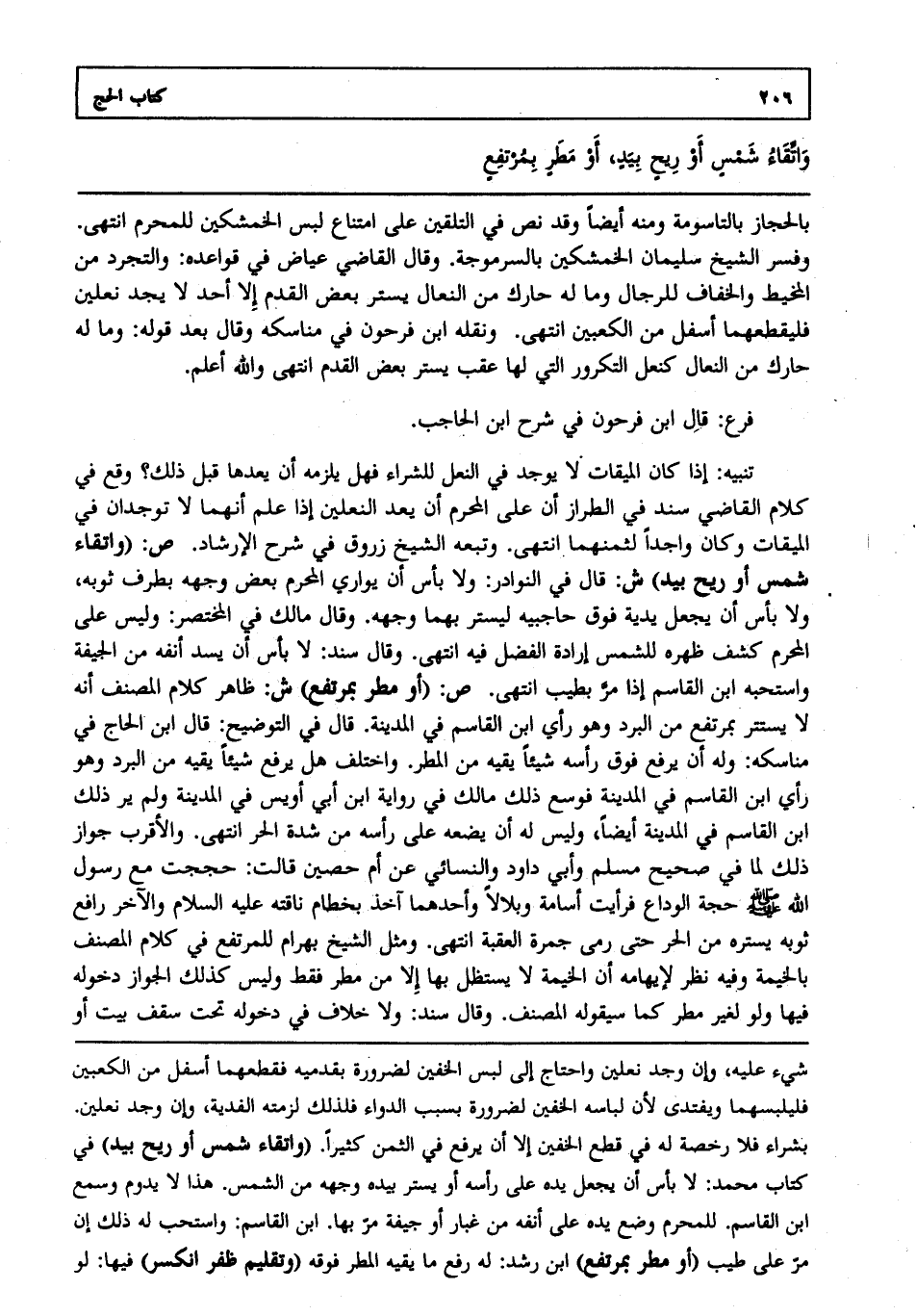 تنبيه: إذا كان الميقات لا يوجد في النعل للشراء فهل يلزمه أن يعدها قبل ذلك وقع في كلام القاضي سند في الطراز أن على المحرم أن يعد النعلين إذا علم أنهما لا توجدان في الميقات وكان واجدا لثمنهما انتهى وتبعه الشيخ زروق في شرح الإرشاد. ص: "واتقاء شمس أو ريح بيد" ش: قال في النوادر ولا بأس أن يواري المحرم بعض وجهه بطرف ثوبه ولا بأس أن يجعل يديه فوق حاجبيه ليستر بهما وجهه. وقال مالك في المختصر وليس على المحرم كشف ظهره للشمس إرادة الفضل فيه انتهى. وقال سند لا بأس أن يسد أنفه من الجيفة واستحبه ابن القاسم إذا مر بطيب انتهى. ص: "أو مطر بمرتفع" ش: ظاهر كلام المصنف أنه لا يستتر بمرتفع من البرد وهو رأي ابن القاسم في المدينة. قال في التوضيح قال ابن الحاج في مناسكه وله أن يرفع فوق رأسه شيئا يقيه من المطر. واختلف هل يرفع شيئا يقيه من البرد وهو رأي ابن القاسم في المدينة فوسع ذلك مالك في رواية ابن أبي أويس في المدينة ولم ير ذلك ابن القاسم في المدينة أيضا وليس له أن يضعه على رأسه من شدة الحر انتهى. والأقرب جواز ذلك لما في صحيح مسلم وأبي داود والنسائي عن أم حصين قالت حججت مع رسول الله صلى الله عليه وسلم حجة الوداع فرأيت أسامة وبلالا وأحدهما آخذ بخطام ناقته عليه السلام والآخر رافع ثوبه يستره من الحر حتى رمى جمرة العقبة انتهى. ومثل الشيخ بهرام للمرتفع في كلام المصنف بالخيمة وفيه نظر لإيهامه أن الخيمة لا يستظل بها إلا من مطر فقط وليس كذلك الجواز دخوله فيها ولو لغير مطر كما سيقوله المصنف. فقال سند ولا خلاف في دخوله تحت سقف بيت أو