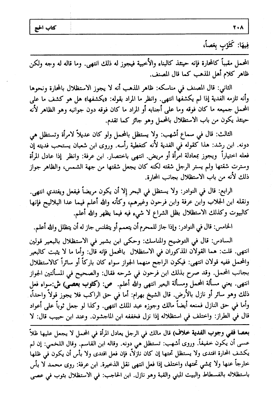 الثاني: قال المصنف في مناسكه ظاهر المذهب أنه لا يجوز الاستظلال بالمحارة ونحوها وأنه تلزمه الفدية إذا لم يكشفها انتهى. وانظر ما المراد بقوله "يكشفها" هل هو كشف ما على المحمل جميعه ما كان فوقه وما على أجنابه أو المراد ما كان فوقه دون جوانبه وهو الظاهر لأنه حينئذ يكون من باب الاستظلال بالمحمل وهو جائز كما تقدم.