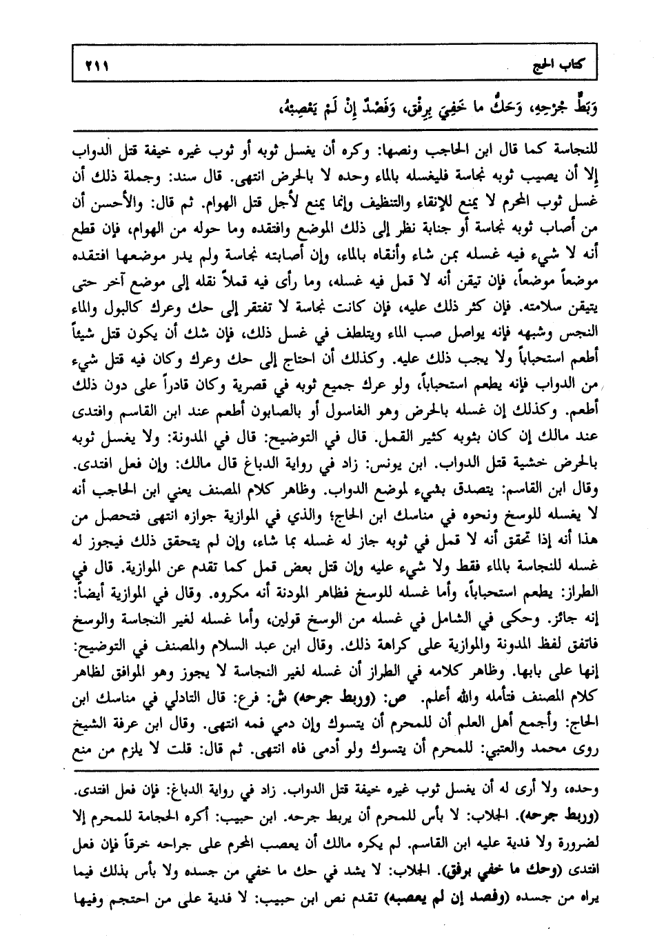 للنجاسة كما قال ابن الحاجب ونصها وكره أن يغسل ثوبه أو ثوب غيره خيفة قتل الدواب إلا أن يصيب ثوبه نجاسة فليغسله بالماء وحده لا بالحرض انتهى. قال سند وجملة ذلك أن غسل ثوب المحرم لا يمنع للإنقاء والتنظيف وإنما يمنع لأجل قتل الهوام. ثم قال والأحسن أن من أصاب ثوبه نجاسة أو جنابة نظر إلى ذلك الموضع وافتقده وما حوله من الهوام فإن قطع أنه لا شيء فيه غسله بمن شاء وأنقاه بالماء وإن أصابته نجاسة ولم يدر موضعها افتقده موضعا موضعا فإن تيقن أنه لا قمل فيه غسله وما رأى فيه قملا نقله إلى موضع آخر حتى يتيقن سلامته. فإن كثر ذلك عليه فإن كانت نجاسة لا تفتقر إلى حك وعرك كالبول والماء النجس وشبهه فإنه يواصل صب الماء ويتلطف في غسل ذلك فإن شك أن يكون قتل شيئا أطعم استحبابا ولا يجب ذلك عليه. وكذلك إن احتاج إلى حك وعرك وكان فيه قتل شيء من الدواب فإنه يطعم استحبابا ولو عرك جميع ثوبه في قصرية وكان قادرا على دون ذلك أطعم. وكذلك إن غسله بالحرض وهو الغاسول أو بالصابون أطعم عند ابن القاسم وافتدى عند مالك إن كان بثوبه كثير القمل. قال في التوضيح قال في المدونة ولا يغسل ثوبه بالحرض خشية قتل الدواب. ابن يونس زاد في رواية الدباغ قال مالك وإن فعل افتدى. وقال ابن القاسم يتصدق بشيء لموضع الدواب. وظاهر كلام المصنف يعني ابن الحاجب أنه لا يغسله للوسخ ونحوه في مناسك ابن الحاج والذي في الموازية جوازه انتهى فتحصل من هذا أنه إذا تحقق أنه لا قمل في ثوبه جاز له غسله بما شاء وإن لم يتحقق ذلك فيجوز له غسله للنجاسة بالماء فقط ولا شيء عليه وإن قتل بعض قمل كما تقدم عن الموازية. قال في الطراز يطعم استحبابا وأما غسله للوسخ فظاهر المدونة أنه مكروه. وقال في الموازية أيضا إنه جائز. وحكى في الشامل في غسله من الوسخ قولين وأما غسله لغير النجاسة والوسخ فاتفق لفظ المدونة والموازية على كراهة ذلك. وقال ابن عبد السلام والمصنف في التوضيح إنها على بابها. وظاهر كلامه في الطراز أن غسله لغير النجاسة لا يجوز وهو الموافق لظاهر كلام المصنف فتأمله والله أعلم. ص: "وربط جرحه" ش: