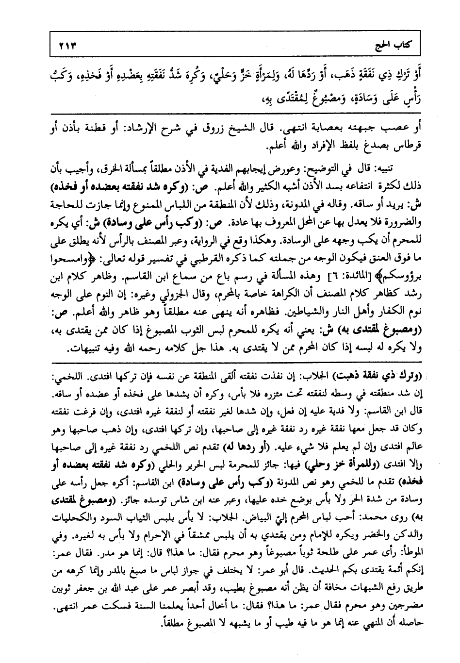 تنبيه: قال في التوضيح وعورض إيجابهم الفدية في الأذن مطلقا بمسألة الخرق وأجيب بأن ذلك لكثرة انتفاعه بسد الأذن أشبه الكثير والله أعلم. ص: "وكره شد نفقته بعضده أو فخذه" ش: يريد أو ساقه. وقاله في المدونة وذلك لأن المنطقة من اللباس الممنوع وإنما جازت للحاجة والضرورة فلا يعدل بها عن المحل المعروف بها عادة. ص: "وكب رأس على وسادة" ش: أي يكره للمحرم أن يكب وجهه على الوسادة. وهكذا وقع في الرواية وعبر المصنف بالرأس لأنه يطلق على ما فوق العنق فيكون الوجه من جملته كما ذكره القرطبي في تفسير قوله تعالى {وَامْسَحُوا بِرُؤُوسِكُمْ} [المائدة: من الآية6] وهذه المسألة في رسم باع من سماع ابن القاسم. وظاهر كلام ابن رشد كظاهر كلام المصنف أن الكراهة خاصة بالمحرم وقال الجزولي وغيره إن النوم على الوجه نوم الكفار وأهل النار والشياطين. فظاهره أنه ينهى عنه مطلقا وهو ظاهر والله أعلم. ص: "ومصبوغ لمقتدى به" ش: يعني أنه يكره للمحرم لبس الثوب المصبوغ إذا كان ممن يقتدى به ولا يكره له لبسه إذا كان المحرم ممن لا يقتدى به. هذا جل كلامه رحمه الله وفيه تنبيهات.