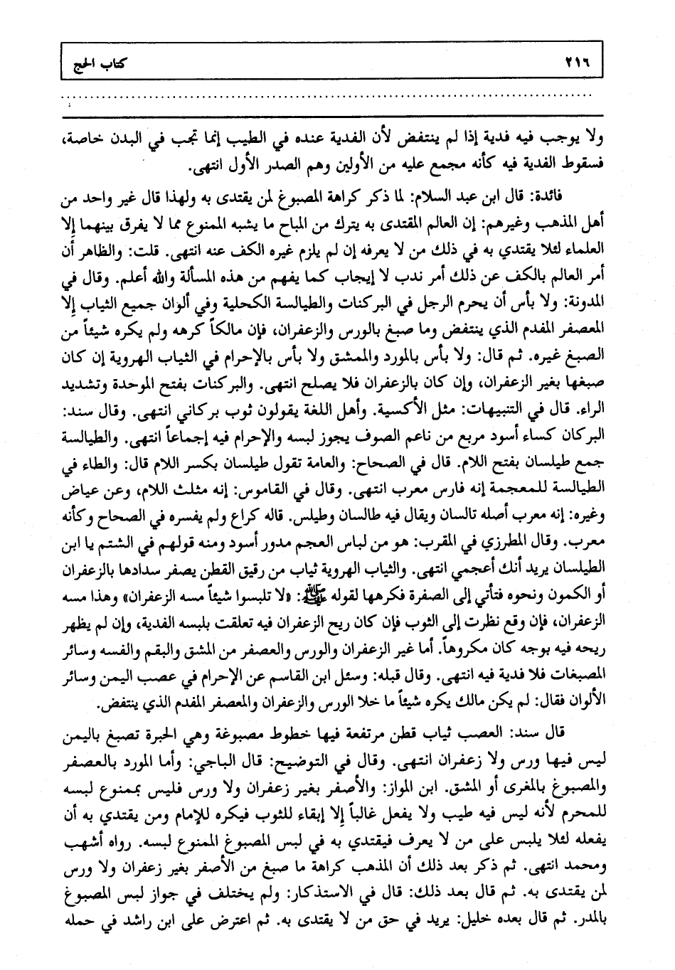 فائدة قال ابن عبد السلام لما ذكر كراهة المصبوغ لمن يقتدى به ولهذا قال غير واحد من أهل المذهب وغيرهم إن العالم المقتدى به يترك من المباح ما يشبه الممنوع مما لا يفرق بينهما إلا العلماء لئلا يقتدي به في ذلك من لا يعرفه إن لم يلزم غيره الكف عنه انتهى. قلت: والظاهر أن أمر العالم بالكف عن ذلك أمر ندب لا إيجاب كما يفهم من هذه المسألة والله أعلم. وقال في المدونة ولا بأس أن يحرم الرجل في البركنات والطيالسة الكحلية وفي ألوان جميع الثياب إلا المعصفر المفدم الذي ينتفض وما صبغ بالورس والزعفران فإن مالكا كرهه ولم يكره شيئا من الصبغ غيره. ثم قال ولا بأس بالمورد والممشق ولا بأس بالإحرام في الثياب الهروية إن كان صبغها بغير الزعفران وإن كان بالزعفران فلا يصلح انتهى. والبركنات بفتح الموحدة وتشديد الراء. قال في التنبيهات: مثل الأكسية. وأهل اللغة يقولون ثوب بركاني انتهى. وقال سند البركان كساء أسود مربع من ناعم الصوف يجوز لبسه والإحرام فيه إجماعا انتهى. والطيالسة جمع طيلسان بفتح اللام. قال في الصحاح والعامة تقول طيلسان بكسر اللام قال والطاء في الطيالسة للمعجمة إنه فارس معرب انتهى. وقال في القاموس إنه مثلث اللام وعن عياض وغيره إنه معرب أصله تالسان ويقال فيه طالسان وطيلس قاله كراع ولم يفسره في الصحاح وكأنه معرب وقال المطرزي في المقرب هو من لباس العجم مدور أسود ومنه قولهم في الشتم يا ابن الطيلسان يريد أنك أعجمي انتهى والثياب الهروية ثياب من رقيق القطن يصفر سدادها بالزعفران أو الكمون ونحوه فتأتي إلى الصفرة فكرهها لقوله صلى الله عليه وسلم "لا تلبسوا شيئا مسه الزعفران" وهذا مسه الزعفران فإن وقع نظرت إلى الثوب فإن كان ريح الزعفران فيه تعلقت بلبسه الفدية وإن لم يظهر ريحه فيه بوجه كان مكروها أما غير الزعفران والورس والعصفر من المشق والبقم والفسه وسائر المصبغات فلا فدية فيه انتهى وقال قبله وسئل ابن القاسم عن الإحرام في عصب اليمن وسائر الألوان فقال لم يكن مالك يكره شيئا ما خلا الورس والزعفران والمعصفر المفدم الذي ينتفض