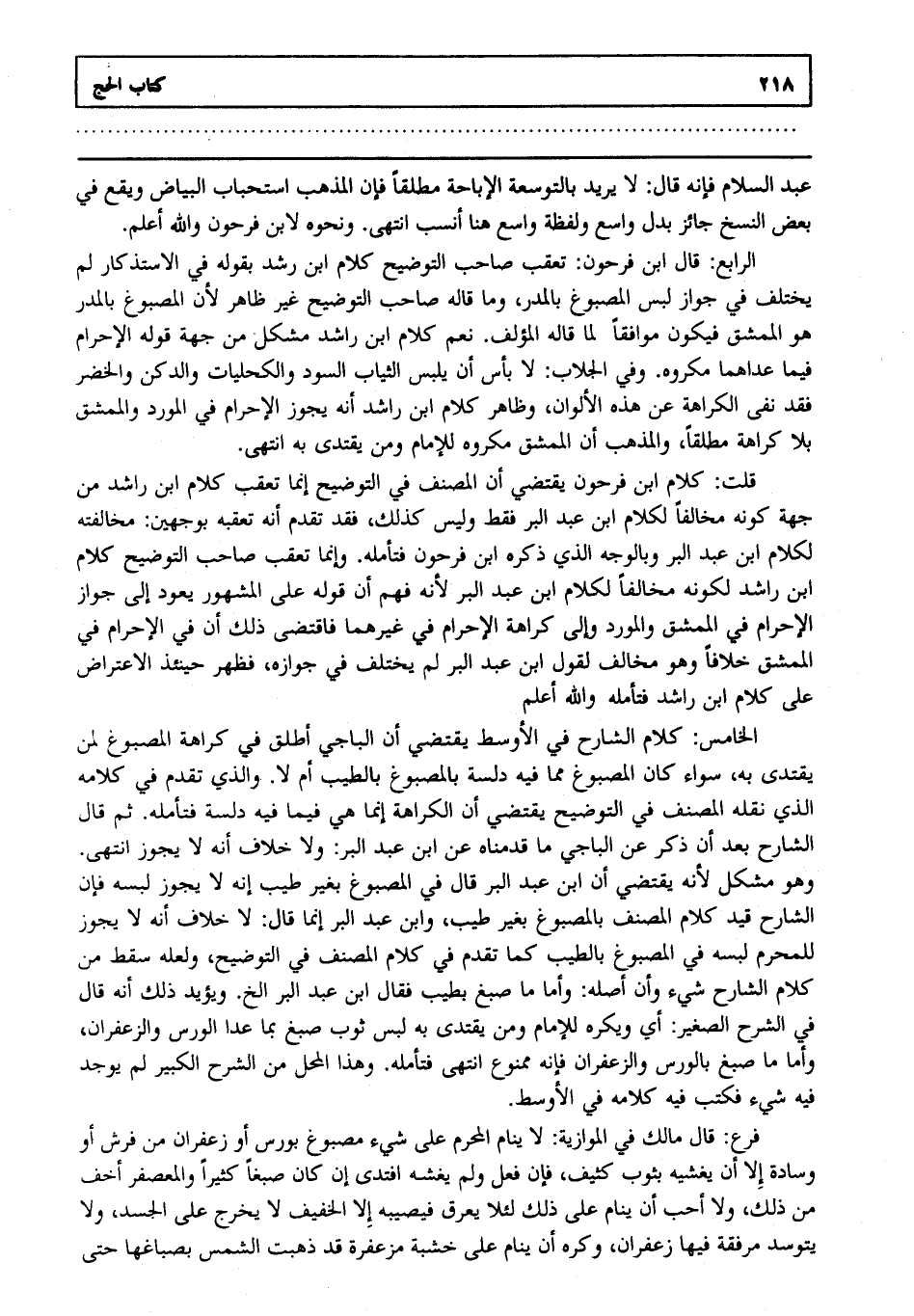 الرابع: قال ابن فرحون تعقب صاحب التوضيح كلام ابن رشد بقوله في الاستذكار لم يختلف في جواز لبس المصبوغ بالمدر وما قاله صاحب التوضيح غير ظاهر لأن المصبوغ بالمدر هو الممشق فيكون موافقا لما قاله المؤلف. نعم كلام ابن راشد مشكل من جهة قوله الإحرام فيما عداهما مكروه. وفي الجلاب لا بأس أن يلبس الثياب السود والكحليات والدكن والخضر فقد نفى الكراهة عن هذه الألوان وظاهر كلام ابن راشد أنه يجوز الإحرام في المورد والممشق بلا كراهة مطلقا والمذهب أن الممشق مكروه للإمام ومن يقتدى به انتهى.