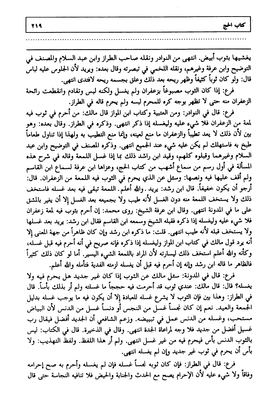 فرع: قال في النوادر ومن العتبية وكتاب ابن المواز قال مالك من أحرم في ثوب فيه لمعة من الزعفران فلا شيء عليه وليغسله إذا ذكر انتهى. وذكره في الطراز. وقال بعده وهو بين لأن ذلك لا يعد تطيبا والزعفران ما منع لعينه وإنما منع التطيب به ولهذا إذا تناول طعاما طبخ به فاستهلك لم يكن عليه شيء عند الجميع انتهى. وذكره المصنف في التوضيح وابن عبد السلام وغيرهما وقبلوه كلهم وقيد ابن راشد ذلك بما إذا غسل اللمعة وقاله في شرح هذه المسألة في أول رسم من سماع أشهب من كتاب الحج وعزاها ابن عرفة لسماع ابن القاسم ولم أقف عليها فيه ونصها وسئل عن الذي يحرم في الثوب فيه اللمعة من الزعفران. قال أرجو أن يكون خفيفا. قال ابن رشد يريد والله أعلم اللمعة تبقى فيه بعد غسله فاستخف ذلك ولا يستخف اللمعة منه دون الغسل لأنه طيب ولا بجميعه بعد الغسل إلا أن يغير بالمشق على ما في المدونة انتهى. وقال ابن عرفة الشيخ روى محمد إن أحرم بثوب فيه لمعة زعفران فلا شيء عليه وليغسله إذا ذكره فقبله الشيخ وسمعه ابن القاسم فقال ابن رشد يريد بعد غسلها ولا يستخف قبله لأنه طيب انتهى. قلت: ما ذكره ابن رشد وإن كان ظاهرا من جهة المعنى إلا أنه يرد قول مالك في كتاب ابن المواز وليغسله إذا ذكره فإنه صريح في أنه أحرم فيه قبل غسله وكأنه والله أعلم استخف ذلك ليسارته لأن المراد باللمعة الشيء اليسير. أما لو كان ذلك كثيرا فالظاهر ما قاله ابن رشد وإنه إن أحرم فيه قبل أن يغسله لزمته الفدية فتأمله والله أعلم.