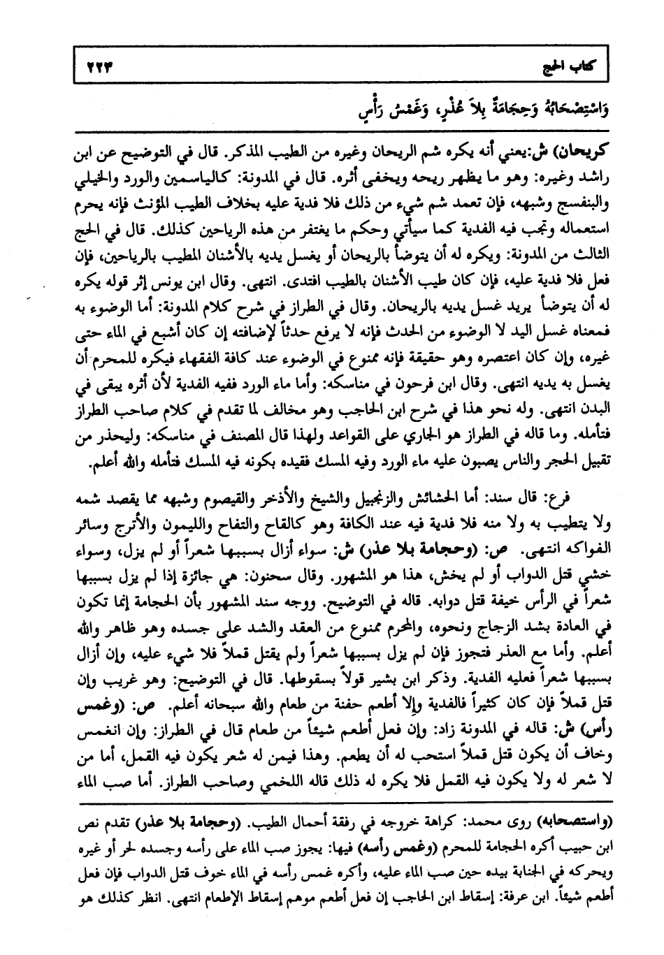فرع: قال سند أما الحشائش والزنجبيل والشيخ والأذخر والقيصوم وشبهه مما يقصد شمه ولا يتطيب به ولا منه فلا فدية فيه عند الكافة وهو كالقاح والتفاح والليمون والأترج وسائر الفواكه انتهى. ص: "وحجامة بلا عذر" ش: سواء أزال بسببها شعرا أو لم يزل وسواء خشي قتل الدواب أو لم يخش هذا هو المشهور. وقال سحنون هي جائزة إذا لم يزل بسببها شعرا في الرأس خيفة قتل دوابه. قاله في التوضيح. ووجه سند المشهور بأن الحجامة إنما تكون في العادة بشد الزجاج ونحوه والمحرم ممنوع من العقد والشد على جسده وهو ظاهر والله أعلم. وأما مع العذر فتجوز فإن لم يزل بسببها شعرا ولم يقتل قملا فلا شيء عليه وإن أزال بسببها شعرا فعليه الفدية. وذكر ابن بشير قولا بسقوطها. قال في التوضيح وهو غريب وإن قتل قملا فإن كان كثيرا فالفدية وإلا أطعم حفنة من طعام والله سبحانه أعلم. ص: "وغمس رأس" ش: قاله في المدونة زاد وإن فعل أطعم شيئا من طعام قال في الطراز وإن انغمس وخاف أن يكون قتل قملا استحب له أن يطعم. وهذا فيمن له شعر يكون فيه القمل أما من لا شعر له ولا يكون فيه القمل فلا يكره له ذلك قاله اللخمي وصاحب الطراز أما صب الماء