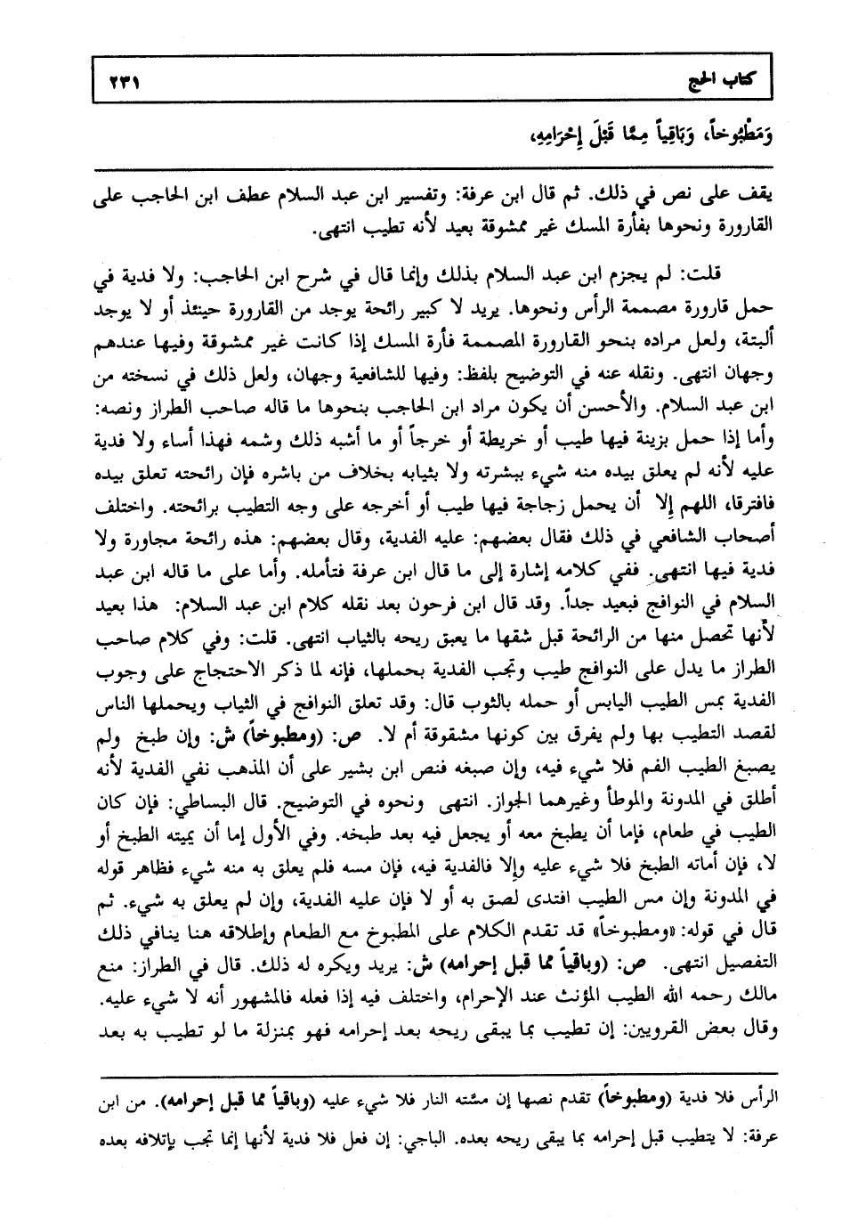 قلت: لم يجزم ابن عبد السلام بذلك وإنما قال في شرح ابن الحاجب ولا فدية في حمل قارورة مصممة الرأس ونحوها. يريد لا كبير رائحة يوجد من القارورة حينئذ أو لا يوجد ألبتة ولعل مراده بنحو القارورة المصممة فأرة المسك إذا كانت غير ممشوقة وفيها عندهم وجهان انتهى. ونقله عنه في التوضيح بلفظ وفيها للشافعية وجهان ولعل ذلك في نسخته من ابن عبد السلام. والأحسن أن يكون مراد ابن الحاجب بنحوها ما قاله صاحب الطراز ونصه وأما إذا حمل بزينة فيها طيب أو خريطة أو خرجا أو ما أشبه ذلك وشمه فهذا أساء ولا فدية عليه لأنه لم يعلق بيده منه شيء ببشرته ولا بثيابه بخلاف من باشره فإن رائحته تعلق بيده فافترقا اللهم إلا أن يحمل زجاجة فيها طيب أو أخرجه على وجه التطيب برائحته. واختلف أصحاب الشافعي في ذلك فقال بعضهم عليه الفدية وقال بعضهم هذه رائحة مجاورة ولا فدية فيها انتهى. ففي كلامه إشارة إلى ما قال ابن عرفة فتأمله . وأما على ما قاله ابن عبد السلام في النوافج فبعيد جدا. وقد قال ابن فرحون بعد نقله كلام ابن عبد السلام هذا بعيد لأنها تحصل منها من الرائحة قبل شقها ما يعبق ريحه بالثياب انتهى. قلت: وفي كلام صاحب الطراز ما يدل على النوافج طيب وتجب الفدية بحملها فإنه لما ذكر الاحتجاج على وجوب الفدية بمس الطيب اليابس أو حمله بالثوب قال وقد تعلق النوافج في الثياب ويحملها الناس لقصد التطيب بها ولم يفرق بين كونها مشقوقة أم لا ص: "ومطبوخا" ش: وإن طبخ ولم يصبغ الطيب الفم فلا شيء فيه وإن صبغه فنص ابن بشير على أن المذهب نفي الفدية لأنه أطلق في المدونة والموطأ وغيرهما الجواز. انتهى ونحوه في التوضيح. قال البساطي فإن كان الطيب في طعام فإما أن يطبخ معه أو يجعل فيه بعد طبخه. وفي الأول إما أن يميته الطبخ أو لا فإن أماته الطبخ فلا شيء عليه وإلا فالفدية فيه فإن مسه فلم يعلق به منه شيء فظاهر قوله في المدونة وإن مس الطيب افتدى لصق به أو لا فإن عليه الفدية وإن لم يعلق به شيء. ثم قال في قوله ومطبوخا قد تقدم الكلام على المطبوخ مع الطعام وإطلاقه هنا ينافي ذلك التفصيل انتهى. ص: "وباقيا مما قبل إحرامه" ش: يريد ويكره له ذلك. قال في الطراز منع مالك رحمه الله الطيب المؤنث عند الإحرام واختلف فيه إذا فعله فالمشهور أنه لا شيء عليه. وقال بعض القرويين إن تطيب بما يبقى ريحه بعد إحرامه فهو بمنزلة ما لو تطيب به بعد