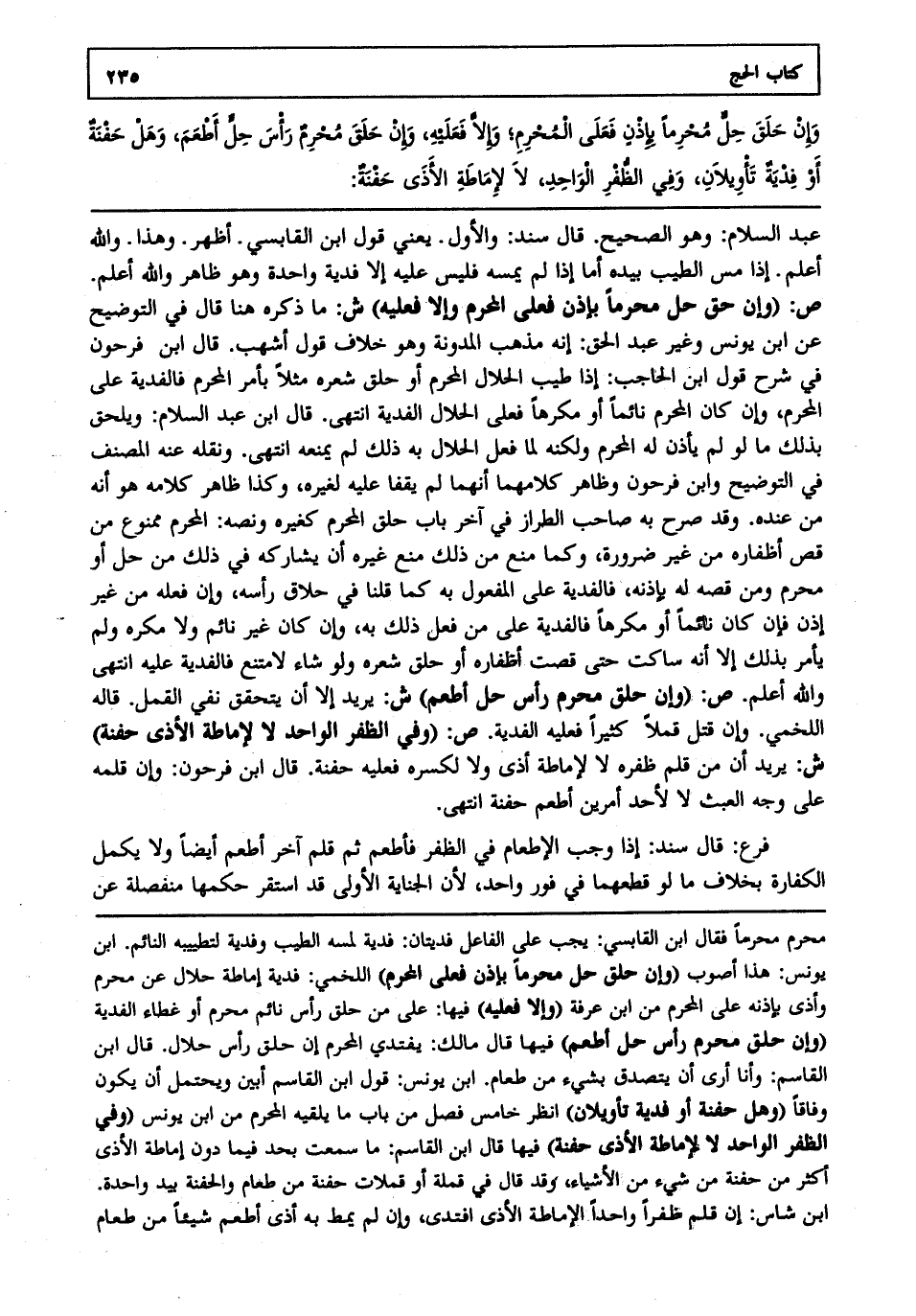 عبد السلام وهو الصحيح. قال سند والأول يعني قول ابن القابسي أظهر وهذا والله أعلم إذا مس الطيب بيده أما إذا لم يمسه فليس عليه إلا فدية واحدة وهو ظاهر والله أعلم. ص: "وإن حلق حل محرما بإذن فعلى المحرم وإلا فعليه" ش: ما ذكره هنا قال في التوضيح عن ابن يونس وغير عبد الحق إنه مذهب المدونة وهو خلاف قول أشهب. قال ابن فرحون في شرح قول ابن الحاجب إذا طيب الحلال المحرم أو حلق شعره مثلا بأمر المحرم فالفدية على المحرم وإن كان المحرم نائما أو مكرها فعلى الحلال الفدية انتهى. قال ابن عبد السلام ويلحق بذلك ما لو لم يأذن له المحرم ولكنه لما فعل الحلال به ذلك لم يمنعه انتهى. ونقله عنه المصنف في التوضيح وابن فرحون وظاهر كلامهما أنهما لم يقفا عليه لغيره وكذا ظاهر كلامه هو أنه من عنده. وقد صرح به صاحب الطراز في آخر باب حلق المحرم كغيره ونصه المحرم ممنوع من قص أظفاره من غير ضرورة وكما منع من ذلك منع غيره أن يشاركه في ذلك من حل أو محرم ومن قصه له بإذنه فالفدية على المفعول به كما قلنا في حلاق رأسه وإن فعله من غير إذن فإن كان نائما أو مكرها فالفدية على من فعل ذلك به وإن كان غير نائم ولا مكره ولم يأمر بذلك إلا أنه ساكت حتى قصت أظفاره أو حلق شعره ولو شاء لامتنع فالفدية عليه انتهى والله أعلم. ص: "وإن حلق محرم رأس حل أطعم" ش: يريد إلا أن يتحقق نفي القمل. قاله اللخمي. وإن قتل قملا كثيرا فعليه الفدية. ص: "وفي الظفر الواحد لا لإماطة الأذى حفنة" ش: يريد أن من قلم ظفره لا لإماطة أذى ولا لكسره فعليه حفنة. قال ابن فرحون وإن قلمه على وجه العبث لا لأحد أمرين أطعم حفنة انتهى.