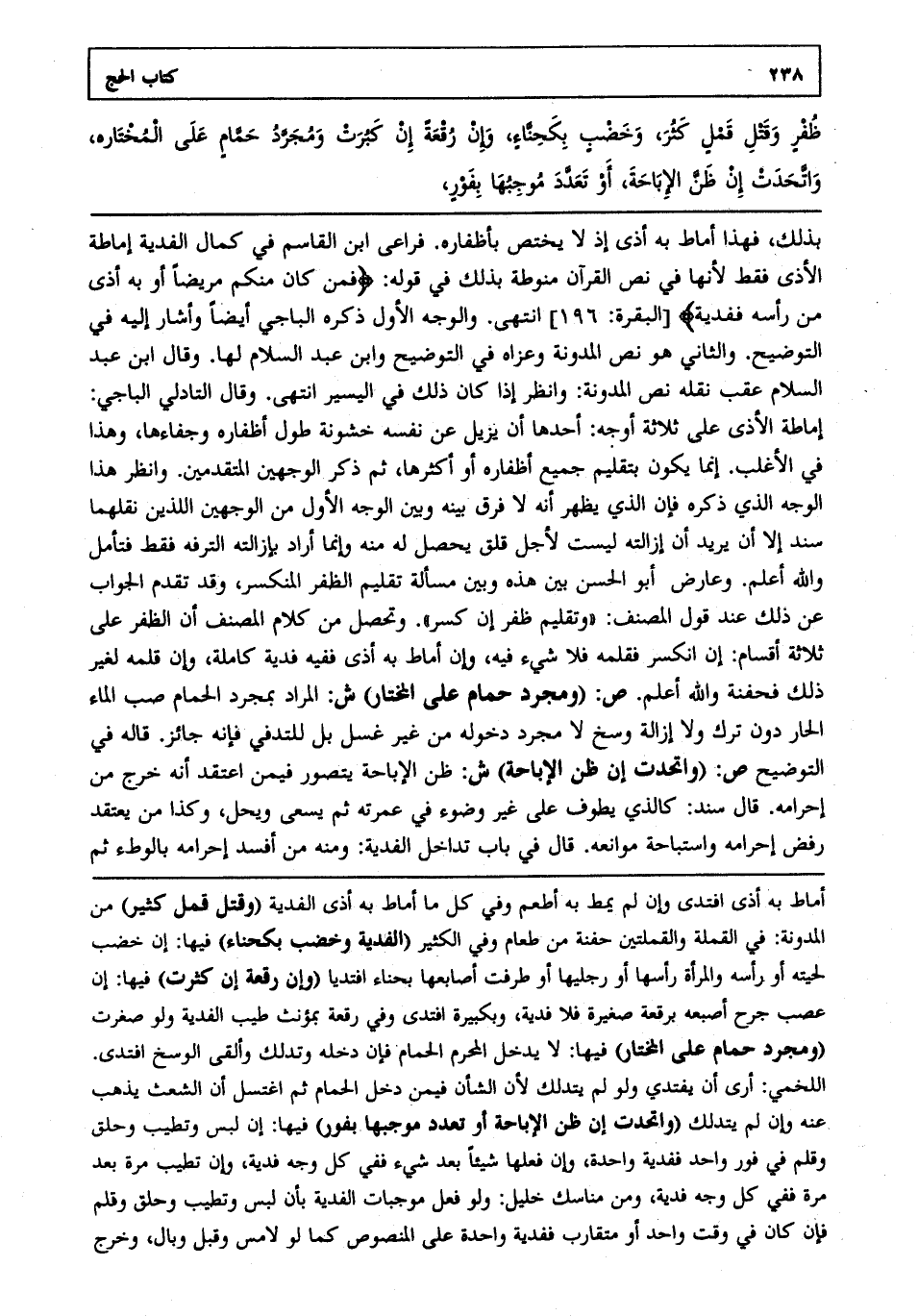 بذلك فهذا أماط به أذى إذ لا يختص بأظفاره. فراعى ابن القاسم في كمال الفدية إماطة الأذى فقط لأنها في نص القرآن منوطة بذلك في قوله {فَمَنْ كَانَ مِنْكُمْ مَرِيضاً أَوْ بِهِ أَذىً مِنْ رَأْسِهِ فَفِدْيَةٌ} [البقرة: من الآية196] انتهى. والوجه الأول ذكره الباجي أيضا وأشار إليه في التوضيح. والثاني هو نص المدونة وعزاه في التوضيح وابن عبد السلام لها. وقال ابن عبد السلام عقب نقله نص المدونة وانظر إذا كان ذلك في اليسير انتهى. وقال التادلي الباجي إماطة الأذى على ثلاثة أوجه أحدها أن يزيل عن نفسه خشونة طول أظفاره وجفاءها وهذا في الأغلب. إنما يكون بتقليم جميع أظفاره أو أكثرها ثم ذكر الوجهين المتقدمين. وانظر هذا الوجه الذي ذكره فإن الذي يظهر أنه لا فرق بينه وبين الوجه الأول من الوجهين اللذين نقلهما سند إلا أن يريد أن إزالته ليست لأجل قلق يحصل له منه وإنما أراد بإزالته الترفه فقط فتأمل والله أعلم. وعارض أبو الحسن بين هذه وبين مسألة تقليم الظفر المنكسر وقد تقدم الجواب عن ذلك عند قول المصنف وتقليم ظفر إن كسر. وتحصل من كلام المصنف أن الظفر على ثلاثة أقسام إن انكسر فقلمه فلا شيء فيه وإن أماط به أذى ففيه فدية كاملة وإن قلمه لغير ذلك فحفنة والله أعلم. ص: "ومجرد حمام على المختار" ش: المراد بمجرد الحمام صب الماء الحار دون ترك ولا إزالة وسخ لا مجرد دخوله من غير غسل بل للتدفي فإنه جائز. قاله في التوضيح ص: "واتحدت إن ظن الإباحة" ش: ظن الإباحة يتصور فيمن اعتقد أنه خرج من إحرامه. قال سند كالذي يطوف على غير وضوء في عمرته ثم يسعى ويحل وكذا من يعتقد رفض إحرامه واستباحة موانعه. قال في باب تداخل الفدية ومنه من أفسد إحرامه بالوطء ثم