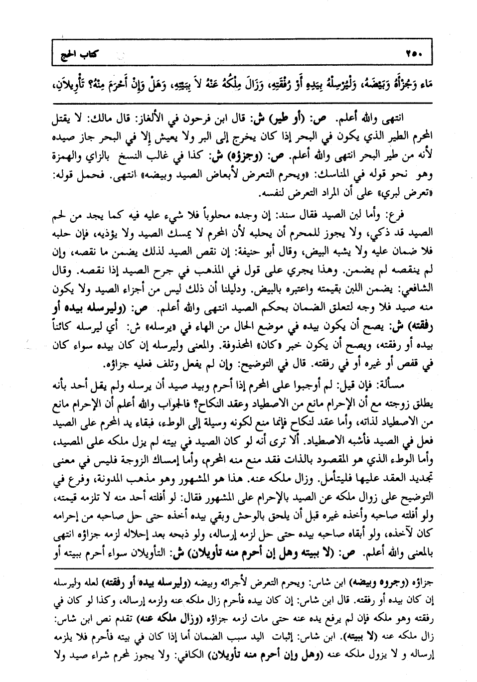 فرع: وأما لبن الصيد فقال سند إن وجده محلوبا فلا شيء عليه فيه كما يجد من لحم الصيد قد ذكي ولا يجوز للمحرم أن يحلبه لأن المحرم لا يمسك الصيد ولا يؤذيه فإن حلبه فلا ضمان عليه ولا يشبه البيض وقال أبو حنيفة إن نقص الصيد لذلك يضمن ما نقصه وإن لم ينقصه لم يضمن. وهذا يجري على قول في المذهب في جرح الصيد إذا نقصه. وقال الشافعي يضمن اللبن بقيمته واعتبره بالبيض. ودليلنا أن ذلك ليس من أجزاء الصيد ولا يكون منه صيد فلا وجه لتعلق الضمان بحكم الصيد انتهى والله أعلم. ص: "وليرسله بيده أو رفقته" ش: يصح أن يكون بيده في موضع الحال من الهاء في "يرسله" ش: أي ليرسله كائنا بيده أو رفقته ويصح أن يكون خبر كان المحذوفة. والمعنى وليرسله إن كان بيده سواء كان في قفص أو غيره أو في رفقته. قال في التوضيح وإن لم يفعل وتلف فعليه جزاؤه.