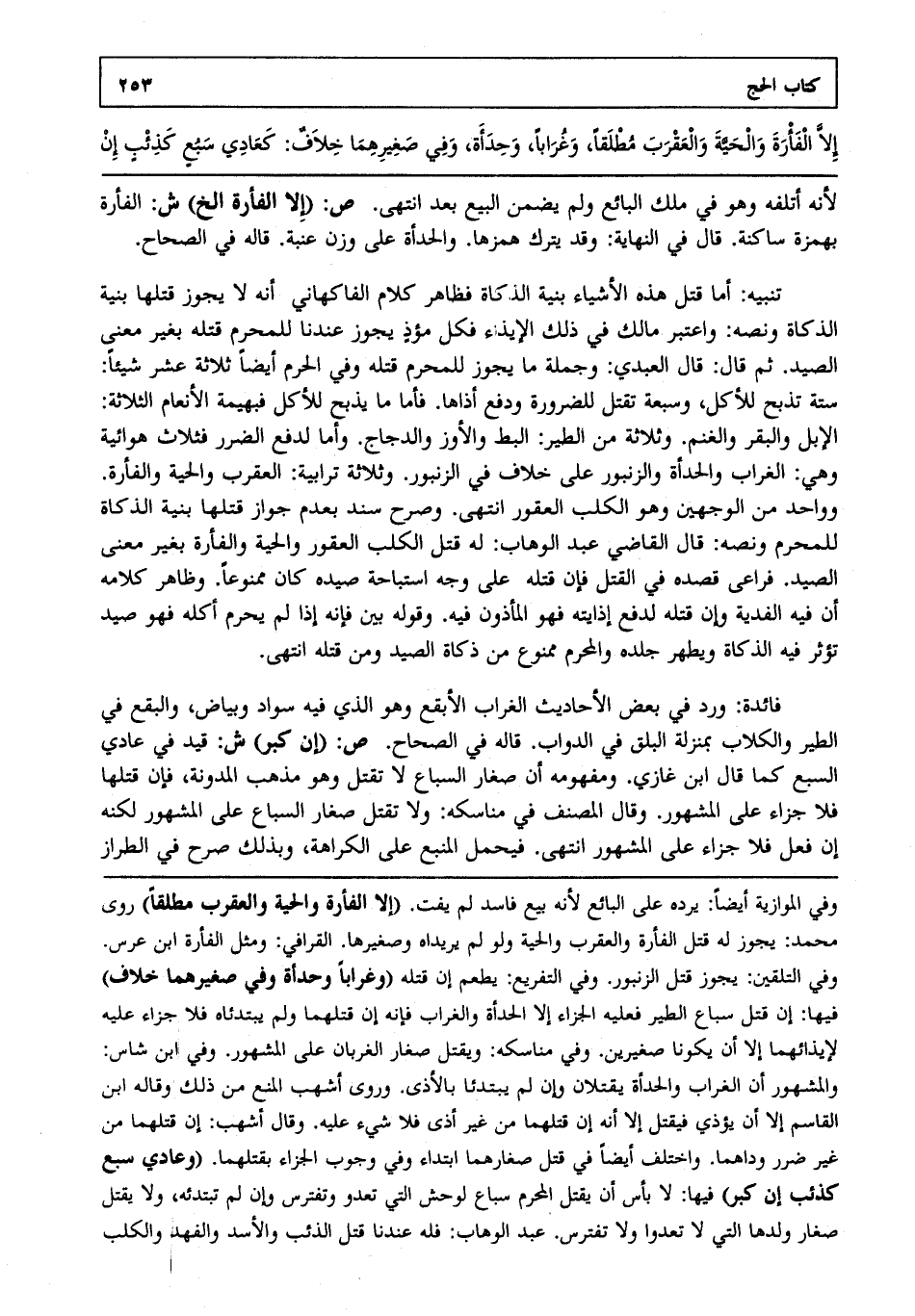تنبيه: أما قتل هذه الأشياء بنية الذكاة فظاهر كلام الفاكهاني أنه لا يجوز قتلها بنية الذكاة ونصه واعتبر مالك في ذلك الإيذاء فكل مؤذ يجوز عندنا للمحرم قتله بغير معنى الصيد. ثم قال قال العبدي وجملة ما يجوز للمحرم قتله وفي الحرم أيضا ثلاثة عشر شيئا ستة تذبح للأكل وسبعة تقتل للضرورة ودفع أذاها. فأما ما يذبح للأكل فبهيمة الأنعام الثلاثة الإبل والبقر والغنم. وثلاثة من الطير البط والأوز والدجاج. الضرر فثلاث هوائية وهي الغراب والحدأة والزنبور على خلاف في الزنبور. وثلاثة ترابية العقرب والحية والفأرة. وواحد من الوجهين وهو الكلب العقور انتهى. وصرح سند بعدم جواز قتلها بنية الذكاة للمحرم ونصه قال القاضي عبد الوهاب له قتل الكلب العقور والحية والفأرة بغير معنى الصيد. فراعى قصده في القتل فإن قتله على وجه استباحة صيده كان ممنوعا. وظاهر كلامه أن فيه الفدية وإن قتله لدفع إذايته فهو المأذون فيه. وقوله بين فإنه إذا لم يحرم أكله فهو صيد تؤثر فيه الذكاة ويطهر جلده والمحرم ممنوع من ذكاة الصيد ومن قتله انتهى.