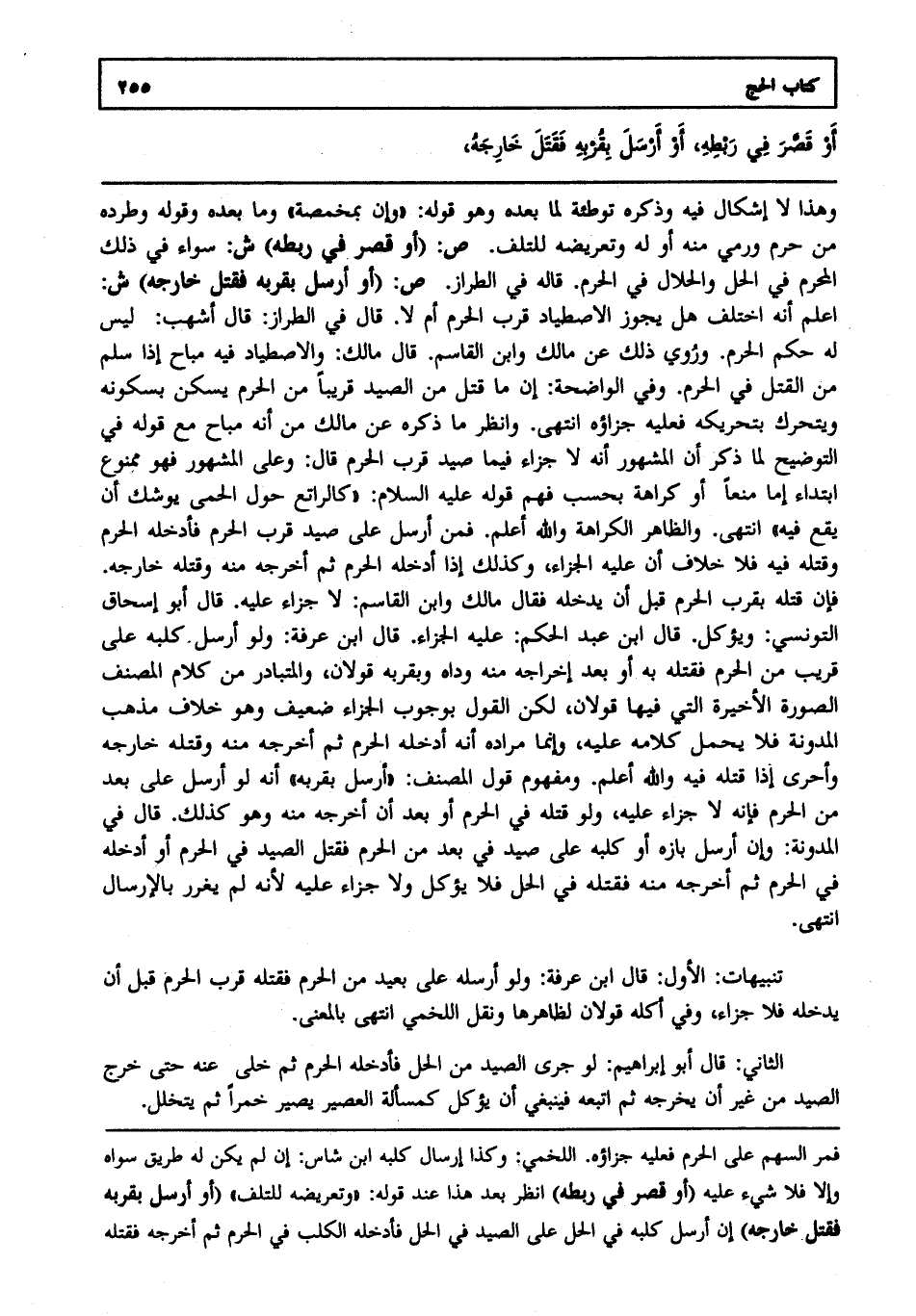 تنبيهات:الأول: قال ابن عرفة ولو أرسله على بعيد من الحرم فقتله قرب الحرم قبل أن يدخله فلا جزاء وفي أكله قولان لظاهرها ونقل اللخمي انتهى بالمعنى.