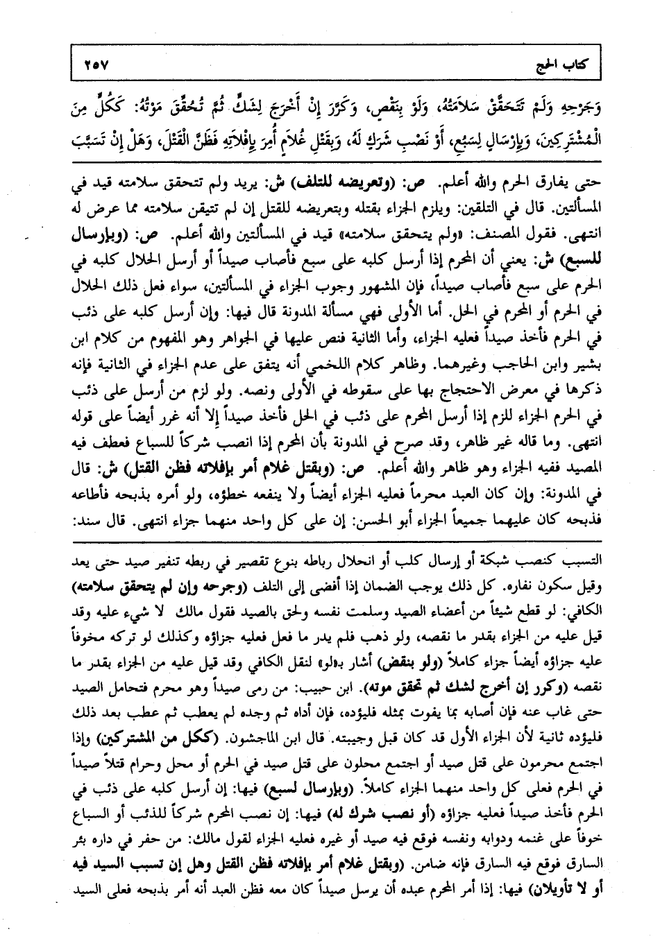 حتى يفارق الحرم والله أعلم. ص: "وتعريضه للتلف" ش: يريد ولم تتحقق سلامته قيد في المسألتين. قال في التلقين ويلزم الجزاء بقتله وبتعريضه للقتل إن لم تتيقن سلامته مما عرض له انتهى. فقول المصنف ولم يتحقق سلامته قيد في المسألتين والله أعلم. ص: "وبإرسال للسبع" ش: يعني أن المحرم إذا أرسل كلبه على سبع فأصاب صيدا أو أرسل الحلال كلبه في الحرم على سبع فأصاب صيدا فإن المشهور وجوب الجزاء في المسألتين سواء فعل ذلك الحلال في الحرم أو المحرم في الحل. أما الأولى فهي مسألة المدونة قال فيها وإن أرسل كلبه على ذئب في الحرم فأخذ صيدا فعليه الجزاء وأما الثانية فنص عليها في الجواهر وهو المفهوم من كلام ابن بشير وابن الحاجب وغيرهما. وظاهر كلام اللخمي أنه يتفق على عدم الجزاء في الثانية فإنه ذكرها في معرض الاحتجاج بها على سقوطه في الأولى ونصه. ولو لزم من أرسل على ذئب في الحرم الجزاء للزم إذا أرسل المحرم على ذئب في الحل فأخذ صيدا إلا أنه غرر أيضا على قوله انتهى. وما قاله غير ظاهر وقد صرح في المدونة بأن المحرم إذا نصب شركا للسباع فعطف فيه المصيد ففيه الجزاء وهو ظاهر والله أعلم. ص: "وبقتل غلام أمر بإفلاته فظن القتل" ش: قال في المدونة وإن كان العبد محرما فعليه الجزاء أيضا ولا ينفعه خطؤه ولو أمره بذبحه فأطاعه فذبحه كان عليهما جميعا الجزاء أبو الحسن إن على كل واحد منهما جزاء انتهى. قال سند: