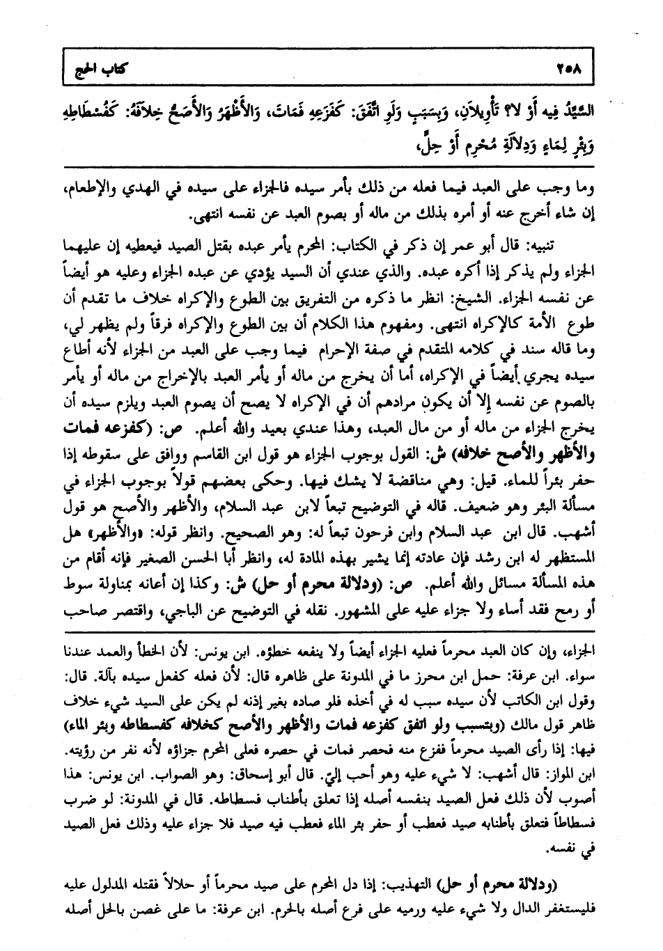 تنبيه: قال أبو عمر إن ذكر في الكتاب المحرم يأمر عبده بقتل الصيد فيعطيه إن عليهما الجزاء ولم يذكر إذا أكره عبده. والذي عندي أن السيد يؤدي عن عبده الجزاء وعليه هو أيضا عن نفسه الجزاء. الشيخ انظر ما ذكره من التفريق بين الطوع والإكراه خلاف ما تقدم أن طوع الأمة كالإكراه انتهى. ومفهوم هذا الكلام أن بين الطوع والإكراه فرقا ولم يظهر لي وما قاله سند في كلامه المتقدم في صفة الإحرام فيما وجب على العبد من الجزاء لأنه أطاع سيده يجري أيضا في الإكراه أما أن يخرج من ماله أو يأمر العبد بالإخراج من ماله أو يأمر بالصوم عن نفسه إلا أن يكون مرادهم أن في الإكراه لا يصح أن يصوم العبد ويلزم سيده أن يخرج الجزاء من ماله أو من مال العبد وهذا عندي بعيد والله أعلم. ص: "كفزعه فمات والأظهر والأصح خلافه" ش: القول بوجوب الجزاء هو قول ابن القاسم ووافق على سقوطه إذا حفر بئرا للماء. قيل وهي مناقضة لا يشك فيها. وحكى بعضهم قولا بوجوب الجزاء في مسألة البئر وهو ضعيف. قاله في التوضيح تبعا لابن عبد السلام والأظهر والأصح هو قول أشهب. قال ابن عبد السلام وابن فرحون تبعا له وهو الصحيح. وانظر قوله والأظهر هل المستظهر له ابن رشد فإن عادته إنما يشير بهذه المادة له وانظر أبا الحسن الصغير فإنه أقام من هذه المسألة مسائل والله أعلم. ص: "ودلالة محرم أو حل" ش: وكذا إن أعانه بمناولة سوط أو رمح فقد أساء ولا جزاء عليه على المشهور. نقله في التوضيح عن الباجي واقتصر صاحب