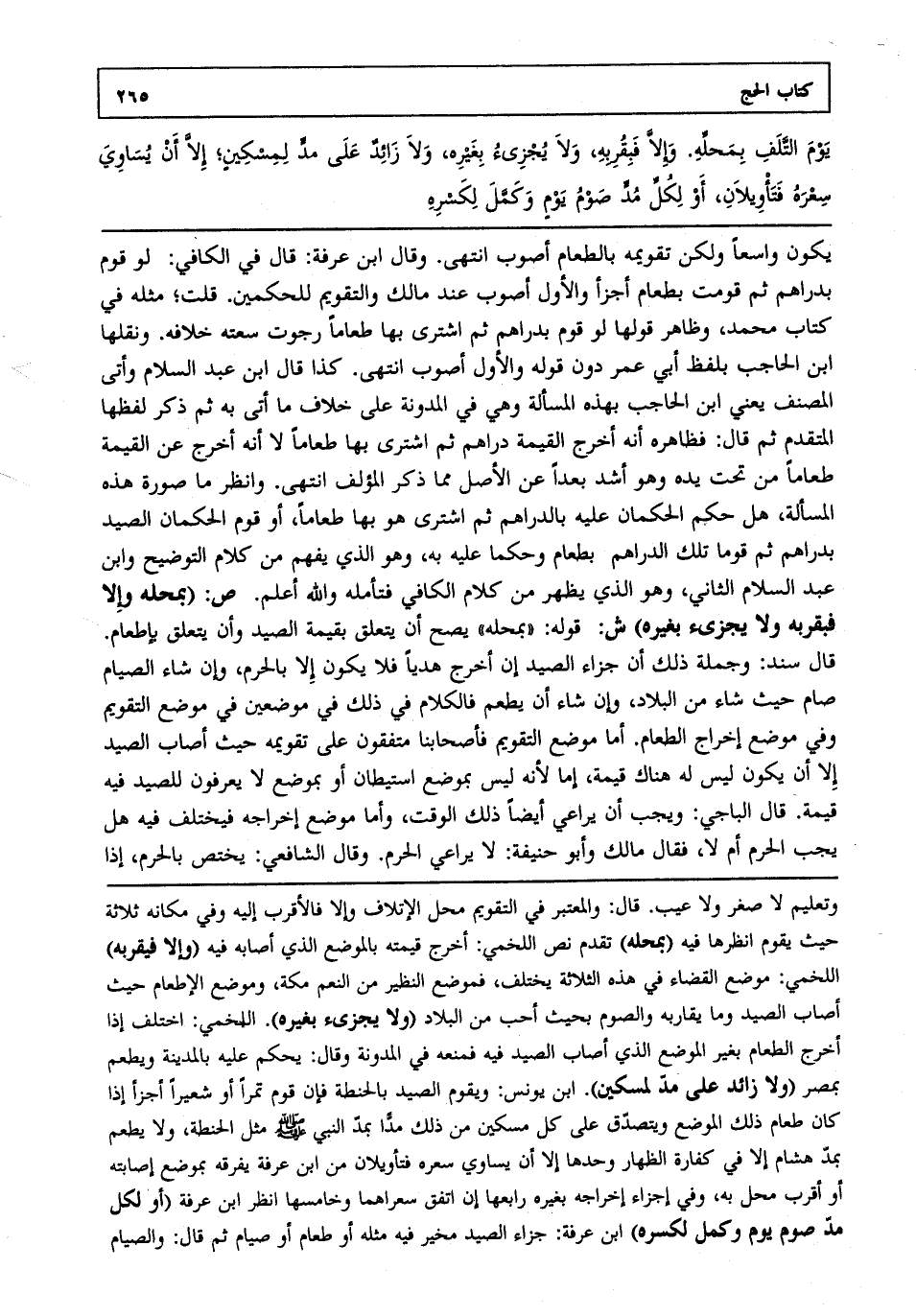 يكون واسعا ولكن تقويمه بالطعام أصوب انتهى. وقال ابن عرفة قال في الكافي لو قوم بدراهم ثم قومت بطعام أجزأ والأول أصوب عند مالك والتقويم للحكمين. قلت: مثله في كتاب محمد وظاهر قولها لو قوم بدراهم ثم اشترى بها طعاما رجوت سعته خلافه. ونقلها ابن الحاجب بلفظ أبي عمر دون قوله والأول أصوب انتهى. كذا قال ابن عبد السلام وأتى المصنف يعني ابن الحاجب بهذه المسألة وهي في المدونة على خلاف ما أتى به ثم ذكر لفظها المتقدم ثم قال فظاهره أنه أخرج القيمة دراهم ثم اشترى بها طعاما لا أنه أخرج عن القيمة طعاما من تحت يده وهو أشد بعدا عن الأصل مما ذكر المؤلف انتهى. وانظر ما صورة هذه المسألة هل حكم الحكمان عليه بالدراهم ثم اشترى هو بها طعاما أو قوم الحكمان الصيد بدراهم ثم قوما تلك الدراهم بطعام وحكما عليه به وهو الذي يفهم من كلام التوضيح وابن عبد السلام الثاني وهو الذي يظهر من كلام الكافي فتأمله والله أعلم. ص: "بمحله وإلا فبقربه ولا يجزئ بغيره" ش: قوله "بمحله" يصح أن يتعلق بقيمة الصيد وأن يتعلق بإطعام. قال سند وجملة ذلك أن جزاء الصيد إن أخرج هديا فلا يكون إلا بالحرم وإن شاء الصيام صام حيث شاء من البلاد وإن شاء أن يطعم فالكلام في ذلك في موضعين في موضع التقويم وفي موضع إخراج الطعام. أما موضع التقويم فأصحابنا متفقون على تقويمه حيث أصاب الصيد إلا أن يكون ليس له هناك قيمة إما لأنه ليس بموضع استيطان أو بموضع لا يعرفون للصيد فيه قيمة. قال الباجي ويجب أن يراعي أيضا ذلك الوقت وأما موضع إخراجه فيختلف فيه هل يجب الحرم أم لا فقال مالك وأبو حنيفة لا يراعي الحرم. وقال الشافعي يختص بالحرم إذا