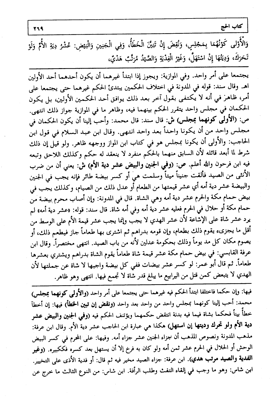 يجتمعا على أمر واحد. وفي الموازية ويجوز إذا ابتدأ غيرهما أن يكون أحدهما أحد الأولين اه. وقال سند قوله في المدونة في اختلاف الحكمين يبتدئ الحكم غيرهما حتى يجتمعا على أمر ظاهر في أنه لا يكتفى بقول آخر بعد ذلك يوافق أحد الحكمين الأولين بل يكون الحكمان في مجلس واحد يتقرر الحكم بينهما فيه وظاهر ما في الموازية جواز ذلك انتهى. ص: "الأولى كونهما بمجلس" ش: قال سند قال محمد وأحب إلينا أن يكون الحكمان في مجلس واحد من أن يكونا واحدا بعد واحد انتهى. وقال ابن عبد السلام في قول ابن الحاجب والأولى أن يكونا بمجلس هو في كتاب ابن المواز ووجهه ظاهر. ولو قيل إن ذلك شرط لما أبعد قائله لأن السابق منهما بالحكم منفرد لا ينعقد له حكم وكذلك اللاحق وتبعه فيه ابن فرحون والله أعلم. ص: "وفي الجنين والبيض عشر دية الأم" ش: يعني أن من ضرب الأنثى من الصيد فألقت جنينا ميتا وسلمت هي أو كسر بيضة طائر فإنه يجب في الجنين والبيضة عشر دية أمه أي عشر قيمتها من الطعام أو عدل ذلك من الصيام وكذلك يجب في بيض حمام مكة والحرم عشر دية أمه وهي الشاة. قال في المدونة وإن أصاب محرم بيضة من حمام مكة أو حلال في الحرم فعليه عشر دية أمه وفي أمه شاة. قال سند قوله "عشر دية أمه" لم يرد عشر شاة على الإشاعة لأن عشر الهدي لا يجب وإنما يجب عشر قيمة الأم على الوسط من أقل ما يجزئ يقوم ذلك بطعام وإن قومه بدراهم ثم اشترى بها طعاما جاز فيطعم ذلك أو يصوم مكان كل مد يوما وذلك بحكومة عدلين لأنه من باب الصيد انتهى مختصرا. وقال ابن عرفة القابسي في بيض حمام مكة عشر قيمة شاة طعاما يقوم الشاة بدراهم ويشتري بعشرها طعاما. ثم قال أبو عمر لو كسر عشر بيضات ففي كل بيضة واجبها لا شاة عن جملتها لأن الهدي لا يتبعض كمن قتل من اليرابيع ما يبلغ قدر شاة لا تجمع فيها انتهى وهو ظاهر.