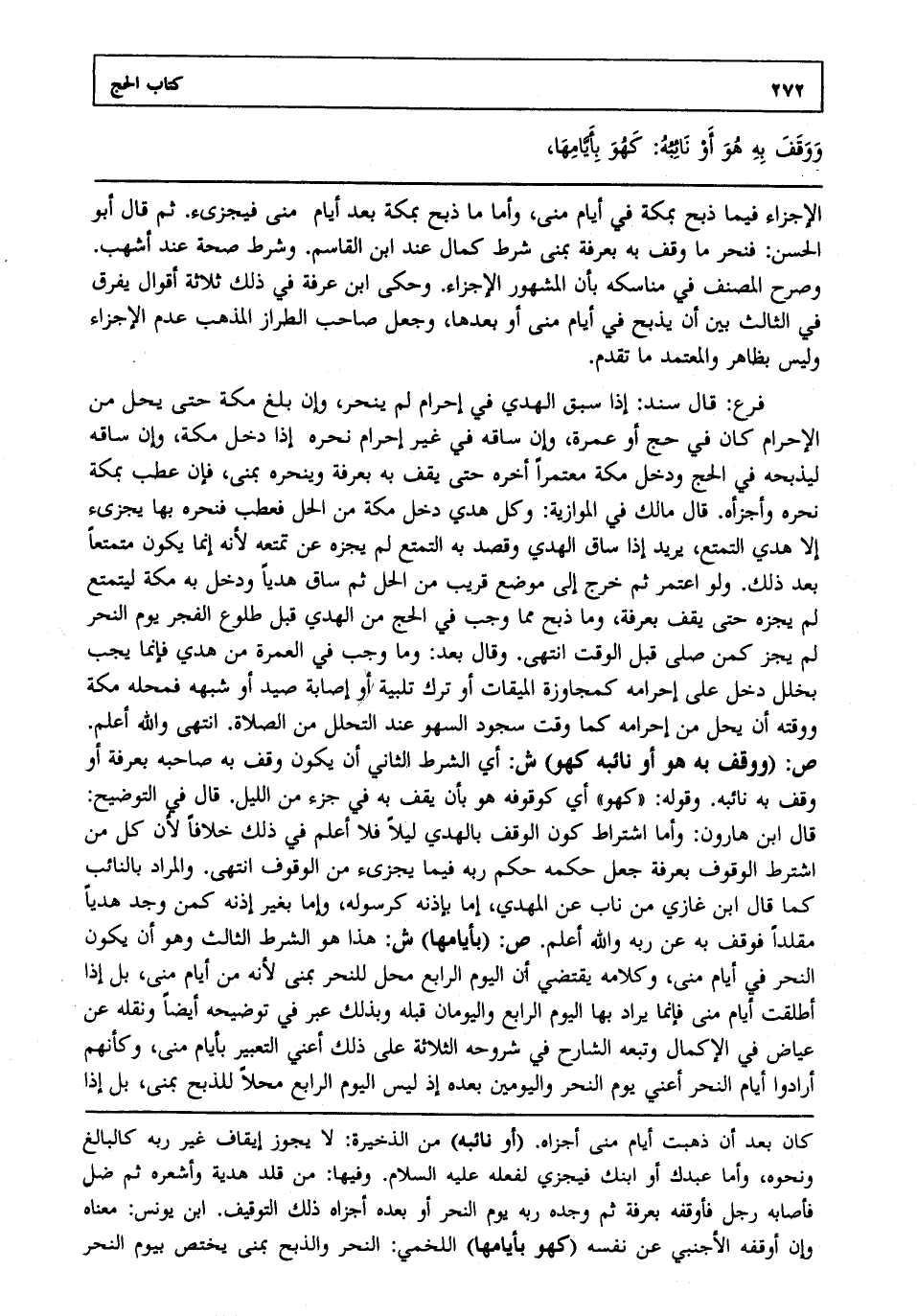 فرع: قال سند إذا سبق الهدي في إحرام لم ينحر وإن بلغ مكة حتى يحل من الإحرام كان في حج أو عمرة وإن ساقه في غير إحرام نحره إذا دخل مكة وإن ساقه ليذبحه في الحج ودخل مكة معتمرا أخره حتى يقف به بعرفة وينحره بمنى فإن عطب بمكة نحره وأجزأه. قال مالك في الموازية وكل هدي دخل مكة من الحل فعطب فنحره بها يجزئ إلا هدي التمتع يريد إذا ساق الهدي وقصد به التمتع لم يجزه عن تمتعه لأنه إنما يكون متمتعا بعد ذلك. ولو اعتمر ثم خرج إلى موضع قريب من الحل ثم ساق هديا ودخل به مكة ليتمتع لم يجزه حتى يقف بعرفة وما ذبح مما وجب في الحج من الهدي قبل طلوع الفجر يوم النحر لم يجز كمن صلى قبل الوقت انتهى. وقال بعد وما وجب في العمرة من هدي فإنما يجب بخلل دخل على إحرامه كمجاوزة الميقات أو ترك تلبية أو إصابة صيد أو شبهه فمحله مكة ووقته أن يحل من إحرامه كما وقت سجود السهو عند التحلل من الصلاة انتهى والله أعلم. ص: "ووقف به هو أو نائبه كهو" ش: أي الشرط الثاني أن يكون وقف به صاحبه بعرفة أو وقف به نائبه. وقوله كهو أي كوقوفه هو بأن يقف به في جزء من الليل. قال في التوضيح قال ابن هارون وأما اشتراط كون الوقف بالهدي ليلا فلا أعلم في ذلك خلافا لأن كل من اشترط الوقوف بعرفة جعل حكمه حكم ربه فيما يجزئ من الوقوف انتهى. والمراد بالنائب كما قال ابن غازي من ناب عن المهدي إما بإذنه كرسوله وإما بغير إذنه كمن وجد هديا مقلدا فوقف به عن ربه والله أعلم. ص: "بأيامها" ش: هذا هو الشرط الثالث وهو أن يكون النحر في أيام منى وكلامه يقتضي أن اليوم الرابع محل للنحر بمنى لأنه من أيام منى بل إذا أطلقت أيام منى فإنما يراد بها اليوم الرابع واليومان قبله وبذلك عبر في توضيحه أيضا ونقله عن عياض في الإكمال وتبعه الشارح في شروحه الثلاثة على ذلك أعني التعبير بأيام منى وكأنهم أرادوا أيام النحر أعني يوم النحر واليومين بعده إذ ليس اليوم الرابع محلا للذبح بمنى بل إذا