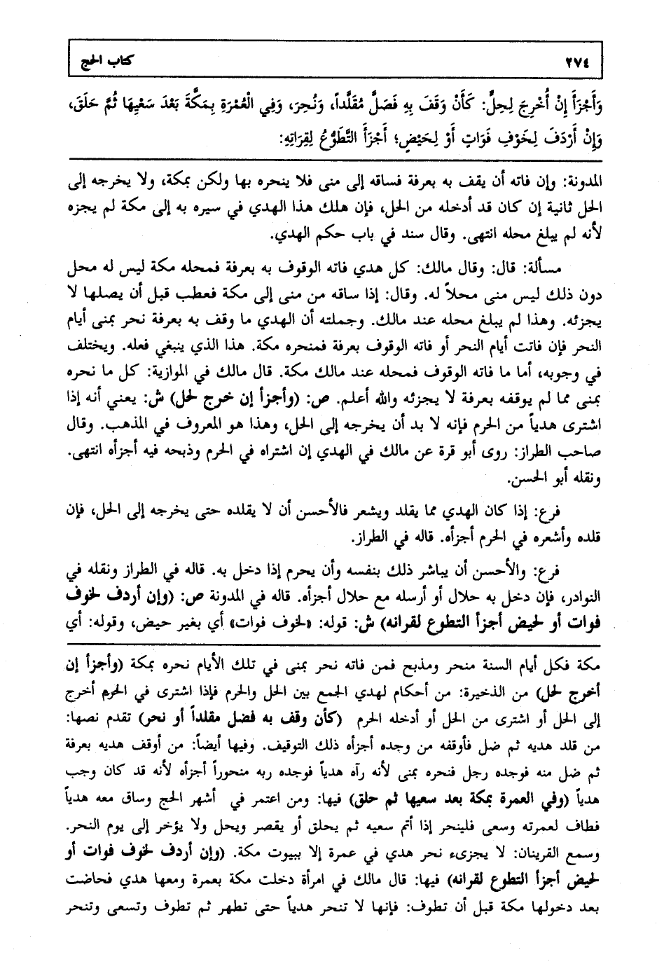 مسألة قال وقال مالك كل هدي فاته الوقوف به بعرفة فمحله مكة ليس له محل دون ذلك ليس منى محلا له. وقال إذا ساقه من منى إلى مكة فعطب قبل أن يصلها لا يجزئه. وهذا لم يبلغ محله عند مالك. وجملته أن الهدي ما وقف به بعرفة نحر بمنى أيام النحر فإن فاتت أيام النحر أو فاته الوقوف بعرفة فمنحره مكة. هذا الذي ينبغي فعله. ويختلف في وجوبه أما ما فاته الوقوف فمحله عند مالك مكة. قال مالك في الموازية كل ما نحره بمنى مما لم يوقفه بعرفة لا يجزئه والله أعلم. ص: "وأجزأ إن خرج لحل" ش: يعني أنه إذا اشترى هديا من الحرم فإنه لا بد أن يخرجه إلى الحل وهذا هو المعروف في المذهب. وقال صاحب الطراز روى أبو قرة عن مالك في الهدي إن اشتراه في الحرم وذبحه فيه أجزأه انتهى. ونقله أبو الحسن.