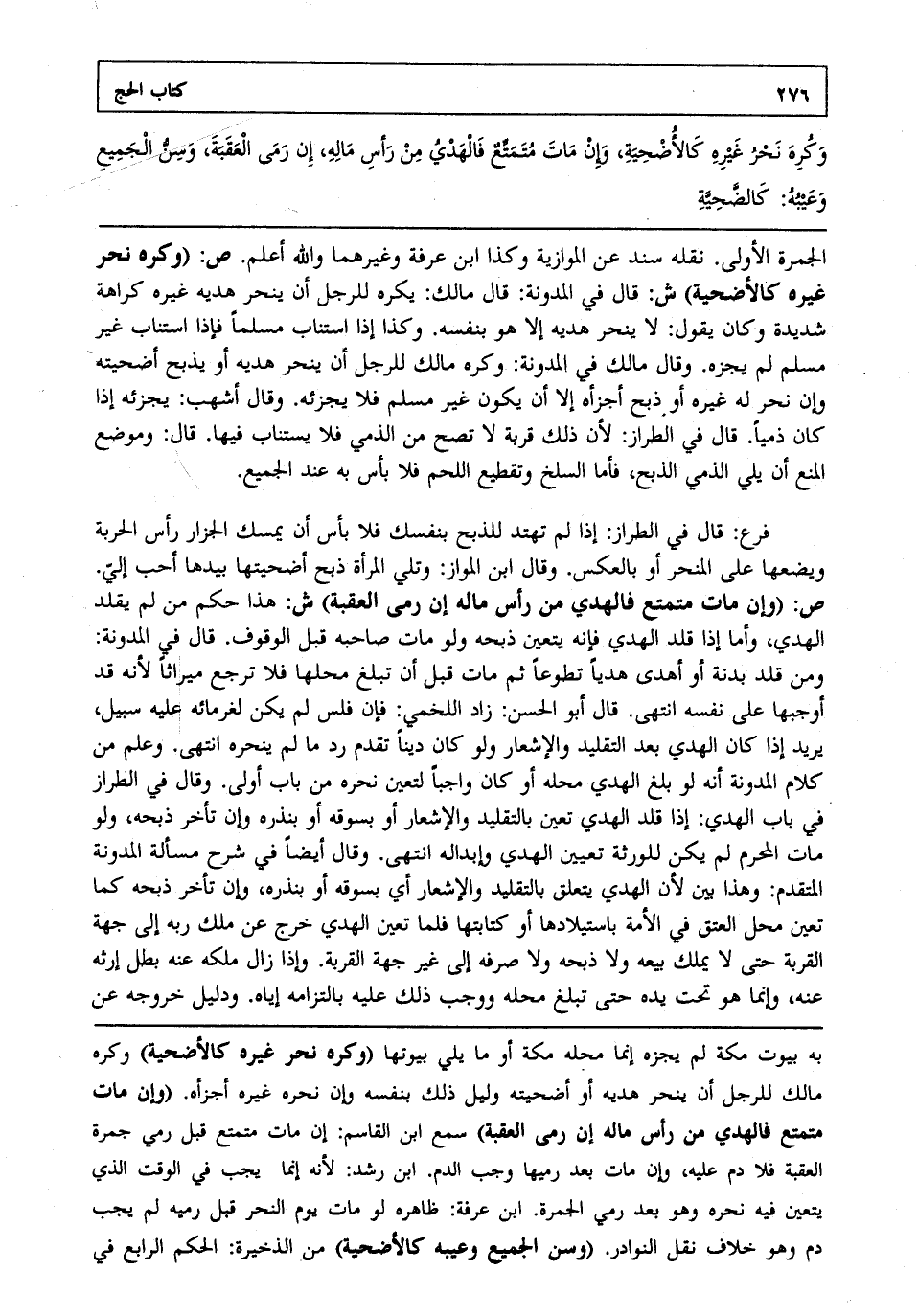 فرع: قال في الطراز إذا لم تهتد للذبح بنفسك فلا بأس أن يمسك الجزار رأس الحربة ويضعها على المنحر أو بالعكس. وقال ابن المواز وتلي المرأة ذبح أضحيتها بيدها أحب إلي. ص: "وإن مات متمتع فالهدي من رأس ماله إن رمى العقبة" ش: هذا حكم من لم يقلد الهدي وأما إذا قلد الهدي فإنه يتعين ذبحه ولو مات صاحبه قبل الوقوف. قال في المدونة ومن قلد بدنة أو أهدى هديا تطوعا ثم مات قبل أن تبلغ محلها فلا ترجع ميراثا لأنه قد أوجبها على نفسه انتهى. قال أبو الحسن زاد اللخمي فإن فلس لم يكن لغرمائه عليه سبيل يريد إذا كان الهدي بعد التقليد والإشعار ولو كان دينا تقدم رد ما لم ينحره انتهى. وعلم من كلام المدونة أنه لو بلغ الهدي محله أو كان واجبا لتعين نحره من باب أولى. وقال في الطراز في باب الهدي إذا قلد الهدي تعين بالتقليد والإشعار أو بسوقه أو بنذره وإن تأخر ذبحه ولو مات المحرم لم يكن للورثة تعيين الهدي وإبداله انتهى. وقال أيضا في شرح مسألة المدونة المتقدم وهذا بين لأن الهدي يتعلق بالتقليد والإشعار أي بسوقه أو بنذره وإن تأخر ذبحه كما تعين محل العتق في الأمة باستيلادها أو كتابتها فلما تعين الهدي خرج عن ملك ربه إلى جهة القربة حتى لا يملك بيعه ولا ذبحه ولا صرفه إلى غير جهة القربة. وإذا زال ملكه عنه بطل إرثه عنه وإنما هو تحت يده حتى تبلغ محله ووجب ذلك عليه بالتزامه إياه. ودليل خروجه عن