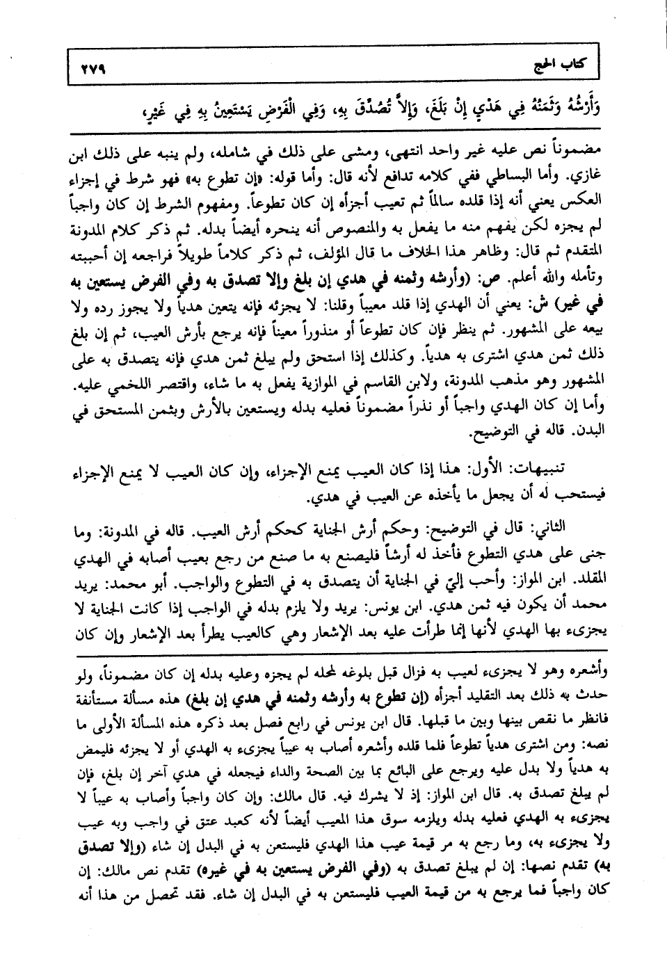 الثاني: قال في التوضيح وحكم أرش الجناية كحكم أرش العيب. قاله في المدونة وما جنى على هدي التطوع فأخذ له أرشا فليصنع به ما صنع من رجع بعيب أصابه في الهدي المقلد. ابن المواز وأحب إلي في الجناية أن يتصدق به في التطوع والواجب. أبو محمد يريد محمد أن يكون فيه ثمن هدي. ابن يونس يريد ولا يلزم بدله في الواجب إذا كانت الجناية لا يجزئ بها الهدي لأنها إنما طرأت عليه بعد الإشعار وهي كالعيب يطرأ بعد الإشعار وإن كان