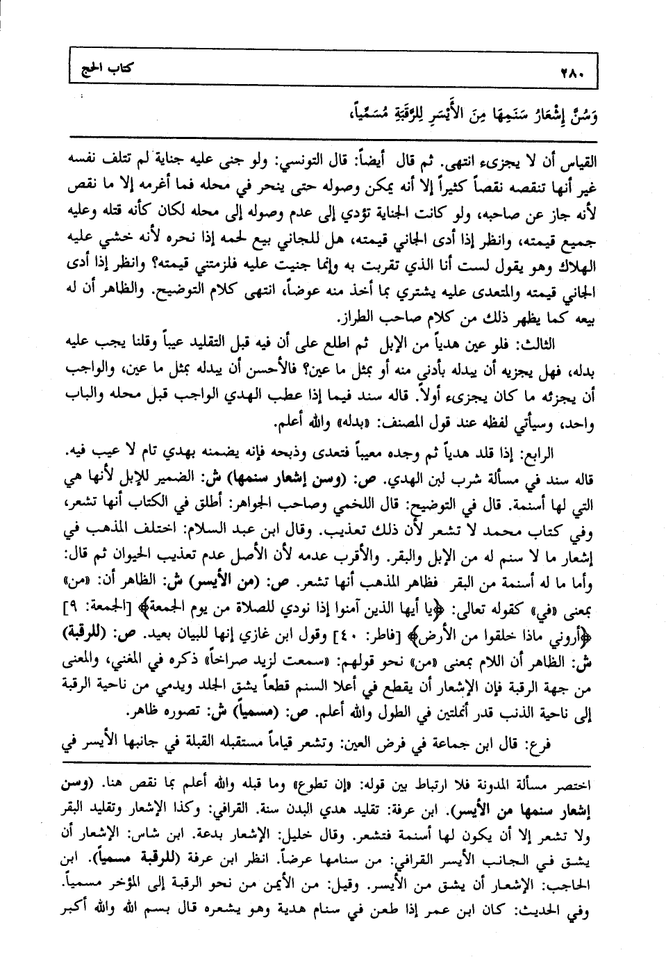 الرابع: إذا قلد هديا ثم وجده معيبا فتعدى وذبحه فإنه يضمنه بهدي تام لا عيب فيه. قاله سند في مسألة شرب لبن الهدي. ص: "وسن إشعار سنمها" ش: الضمير للإبل لأنها هي التي لها أسنمة. قال في التوضيح قال اللخمي وصاحب الجواهر أطلق في الكتاب أنها تشعر وفي كتاب محمد لا تشعر لأن ذلك تعذيب. وقال ابن عبد السلام اختلف المذهب في إشعار ما لا سنم له من الإبل والبقر. والأقرب عدمه لأن الأصل عدم تعذيب الحيوان ثم قال وأما ما له أسنمة من البقر فظاهر المذهب أنها تشعر. ص: "من الأيسر" ش: الظاهر أن من بمعنى في كقوله تعالى {يَا أَيُّهَا الَّذِينَ آمَنُوا إِذَا نُودِيَ لِلصَّلاةِ مِنْ يَوْمِ الْجُمُعَةِ} [الجمعة: من الآية9)] {أَرُونِي مَاذَا خَلَقُوا مِنَ الْأَرْضِ} [فاطر: من الآية40] وقول ابن غازي إنها للبيان بعيد. ص: "للرقبة" ش: الظاهر أن اللام بمعنى من نحو قولهم سمعت لزيد صراخا ذكره في المغني والمعنى من جهة الرقبة فإن الإشعار أن يقطع في أعلا السنم قطعا يشق الجلد ويدمي من ناحية الرقبة إلى ناحية الذنب قدر أنملتين في الطول والله أعلم. ص: "مسميا" ش: تصوره ظاهر.