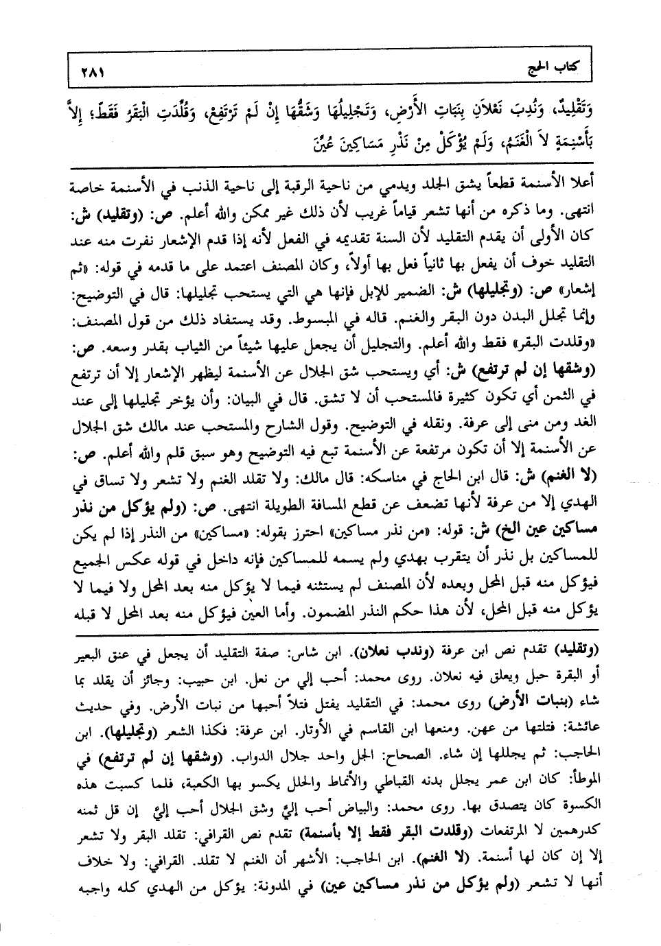 وتقليد وندب نعلان بنبات الأرض وتجليلها وشقها إن لم ترتفع وقلدت البقر فقط إلا بأسنمة لا الغنم ولم يؤكل من نذر مساكين عين