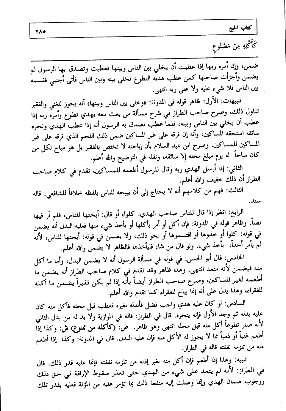 الرابع: انظر إذا قال للناس صاحب الهدي كلوا أو قال أبحتها للناس فلم أر فيها نصا. وظاهر قوله في المدونة فإن أكل أو أمر بأكلها أو بأخذ شيء منها فعليه البدل أنه يضمن في قوله كلوا أو خذوها أو اقتسموها أو نحو ذلك ولا يضمن في قوله أبحتها للناس لأنه لم يأمر أحدا بأخذ شيء. ولو قال من شاء فليأخذها فالظاهر لا يضمن والله أعلم.