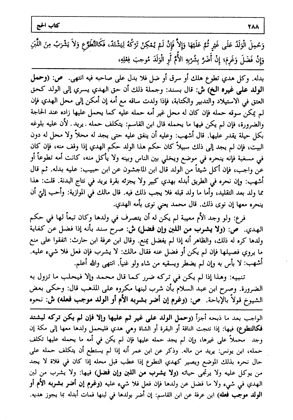 فرع: ولو وجد الأم معيبة لم يكن له أن يتصرف في ولدها وكان تبعا لها في حكم الهدي. ص: "ولا يشرب من اللبن وإن فضل" ش: صرح سند بأنه إذا فضل عن كفاية ولدها كره له ذلك والظاهر أنه إذا لم يفضل يمنع. وقال ابن عرفة ابن حارث اتفقوا على منع ما يروي فصيلها فإن لم يكن أو فضل عنه فقال مالك لا يشرب فإن فعل فلا شيء عليه. أشهب لا بأس به وإن لم يضطر ويسقيه من شاء ولو غنيا. انتهى والله أعلم.