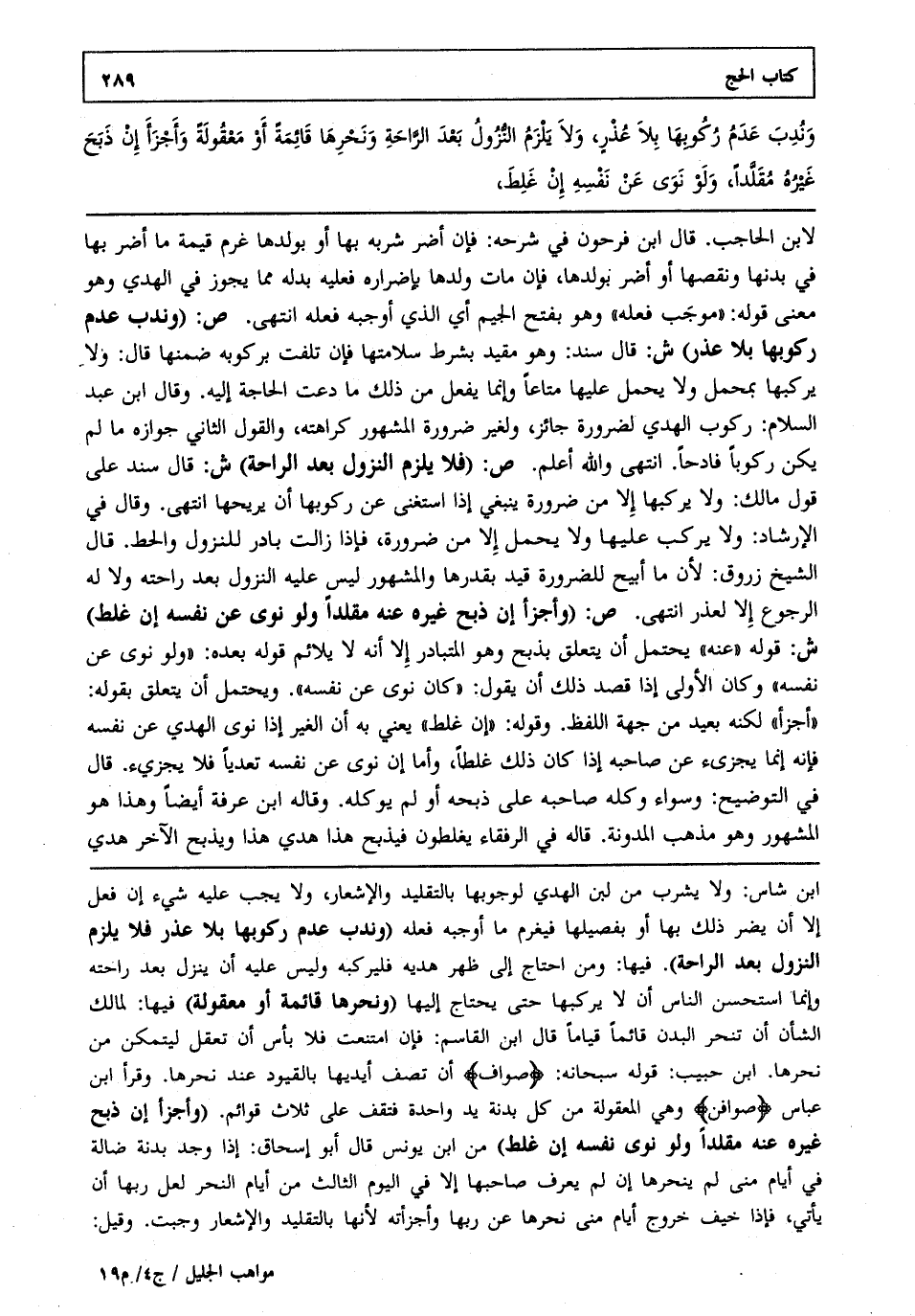 لابن الحاجب. قال ابن فرحون في شرحه فإن أضر شربه بها أو بولدها غرم قيمة ما أضر بها في بدنها ونقصها أو أضر بولدها فإن مات ولدها بإضراره فعليه بدله مما يجوز في الهدي وهو معنى قوله "موجب فعله" وهو بفتح الجيم أي الذي أوجبه فعله انتهى. ص: "وندب عدم ركوبها بلا عذر" ش: قال سند وهو مقيد بشرط سلامتها فإن تلفت بركوبه ضمنها قال ولا يركبها بمحمل ولا يحمل عليها متاعا وإنما يفعل من ذلك ما دعت الحاجة إليه. وقال ابن عبد السلام ركوب الهدي لضرورة جائز ولغير ضرورة المشهور كراهته والقول الثاني: جوازه ما لم يكن ركوبا فادحا. انتهى والله أعلم. ص: "فلا يلزم النزول بعد الراحة" ش: قال سند على قول مالك ولا يركبها إلا من ضرورة ينبغي إذا استغنى عن ركوبها أن يريحها انتهى. وقال في الإرشاد ولا يركب عليها ولا يحمل إلا من ضرورة فإذا زالت بادر للنزول والحط. قال الشيخ زروق لأن ما أبيح للضرورة قيد بقدرها والمشهور ليس عليه النزول بعد راحته ولا له الرجوع إلا لعذر انتهى. ص: "وأجزأ إن ذبح غيره عنه مقلدا ولو نوى عن نفسه إن غلط" ش: قوله عنه يحتمل أن يتعلق بذبح وهو المتبادر إلا أنه لا يلائم قوله بعده ولو نوى عن نفسه وكان الأولى إذا قصد ذلك أن يقول "كان نوى عن نفسه". ويحتمل أن يتعلق بقوله أجزأ لكنه بعيد من جهة اللفظ. وقوله "إن غلط" يعني به أن الغير إذا نوى الهدي عن نفسه فإنه إنما يجزئ عن صاحبه إذا كان ذلك غلطا وأما إن نوى عن نفسه تعديا فلا يجزئ. قال في التوضيح وسواء وكله صاحبه على ذبحه أو لم يوكله. وقاله ابن عرفة أيضا وهذا هو المشهور وهو مذهب المدونة. قاله في الرفقاء يغلطون فيذبح هذا هدي هذا ويذبح الآخر هدي